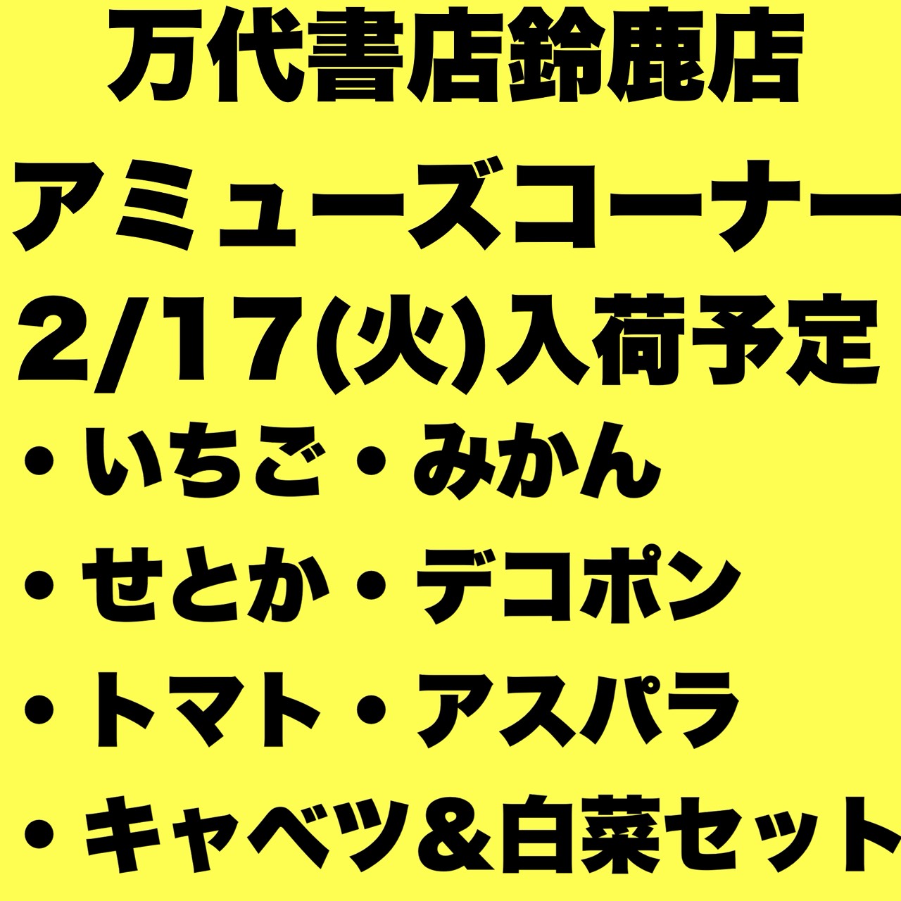 【鈴鹿店】新鮮お野菜フルーツ 2/17(火)火曜日入荷予定です!キタ━(゚∀゚)━( ゚∀)━( ゚)━( )━!!!!! 万代書店鈴鹿店 鈴鹿店 アミューズ 2026年2月15日 ★アミューズコーナー★ 新鮮お野菜フルーツ 2/17(火)火曜日入荷予定です!キタ━(゚∀゚)━( ゚∀)━( ゚)━( )━!!!!! ぜひゲットしにきてください°・*:.。.☆( ◜ω◝ )°・*:.。.☆