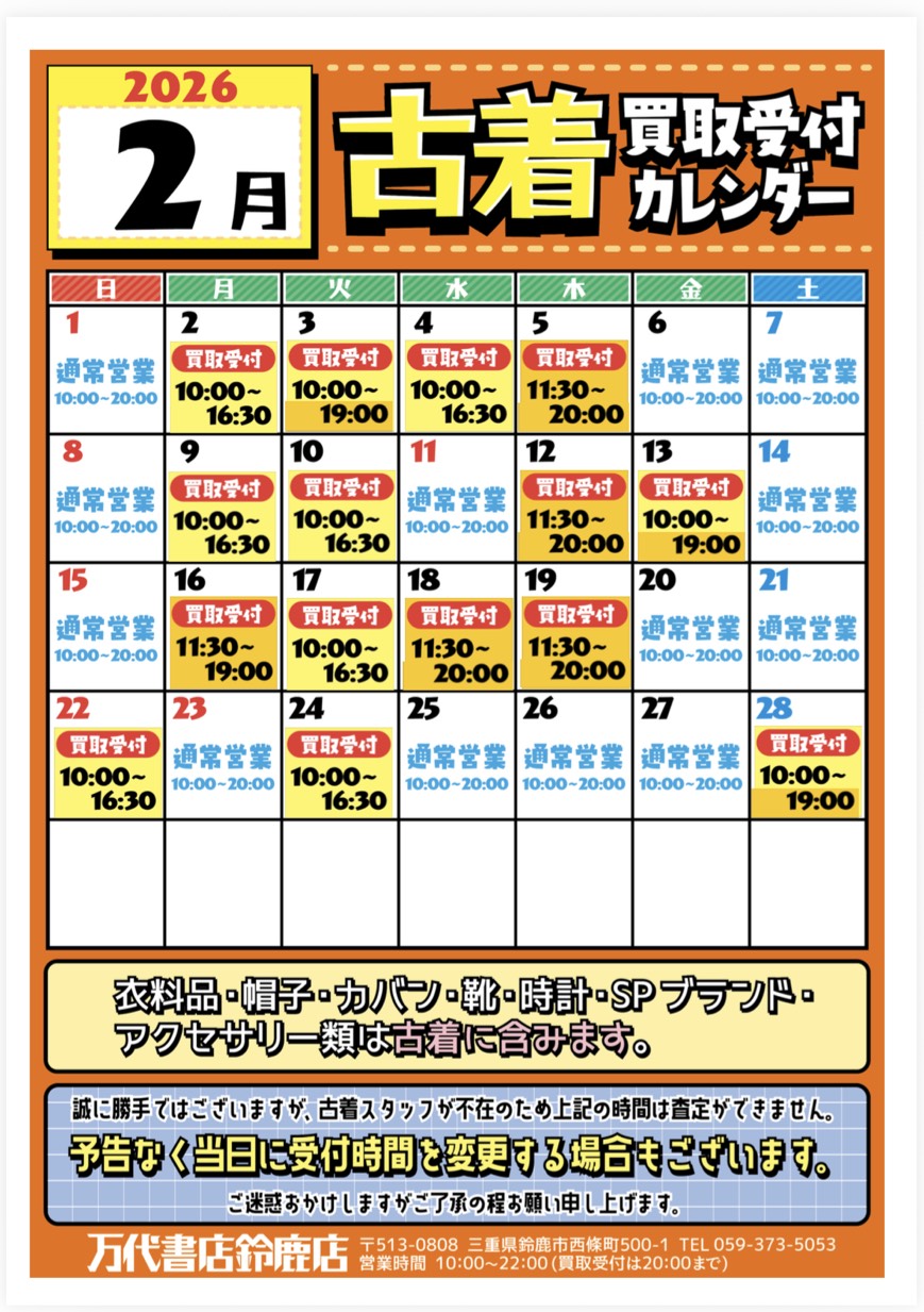 2月度の古着買取カレンダー最新版になります👕👚🧢👟
