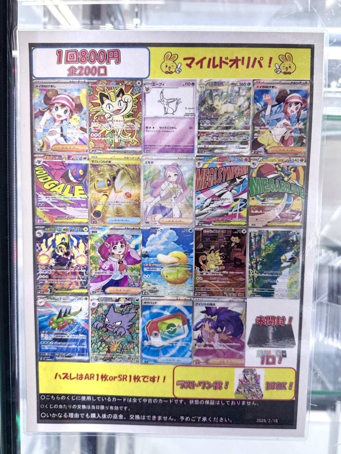 【鈴鹿店】カードコーナーより🎈 マイルドオリパ発売中‼️ 万代書店鈴鹿店 鈴鹿店 カード 2026年2月16日 カードコーナーより🎈 マイルドオリパ発売中‼️ 1回800円 全200口 メイのはげましSARや、ニャースSAR、エーフィ066/SV-Pなどが800円で当たるチャンスです📮 ラストワン賞にムニキスゼロ1BOXご用意しております🎁
