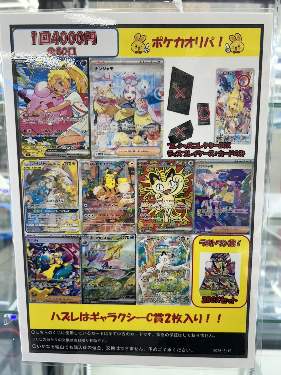 【鈴鹿店】ポケカオリパ発売中! 万代書店鈴鹿店 鈴鹿店 カード 鈴鹿店 ガチャ 2026年2月20日 カードコーナーより🐱! ポケカオリパ発売中! 1回4000円 全80口 リーリエのピッピex 765/742やナンジャモSAR、ピカチュウ 323/S-P(カード+プレシャスコレクターBOX特製ディスプレイフレームのみ)などが当たるチャンス✨ ハズレはギャラクシーC賞2枚入りとなります! ラストワン賞はムニキスゼロ3BOXセットです(*’ω’*)✨