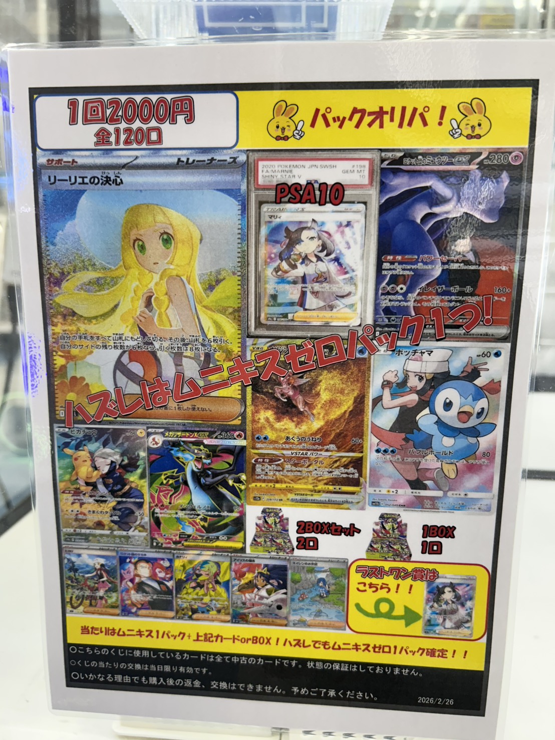 【鈴鹿店】パックオリパ発売中🤩🩵 万代書店鈴鹿店 鈴鹿店 カード 鈴鹿店 ガチャ 2026年2月26日 カードコーナーより‼️ パックオリパ発売中🤩🩵 1回2000円 全 120口 リーリエの決心 SARやマリィ SR PSA10、ムニキスゼロ2BOXセットなどが当たるチャンスです🌟 ハズレてもムニキスゼロ1パック確定😍✨ ラストワン賞はマリィSRになります✨