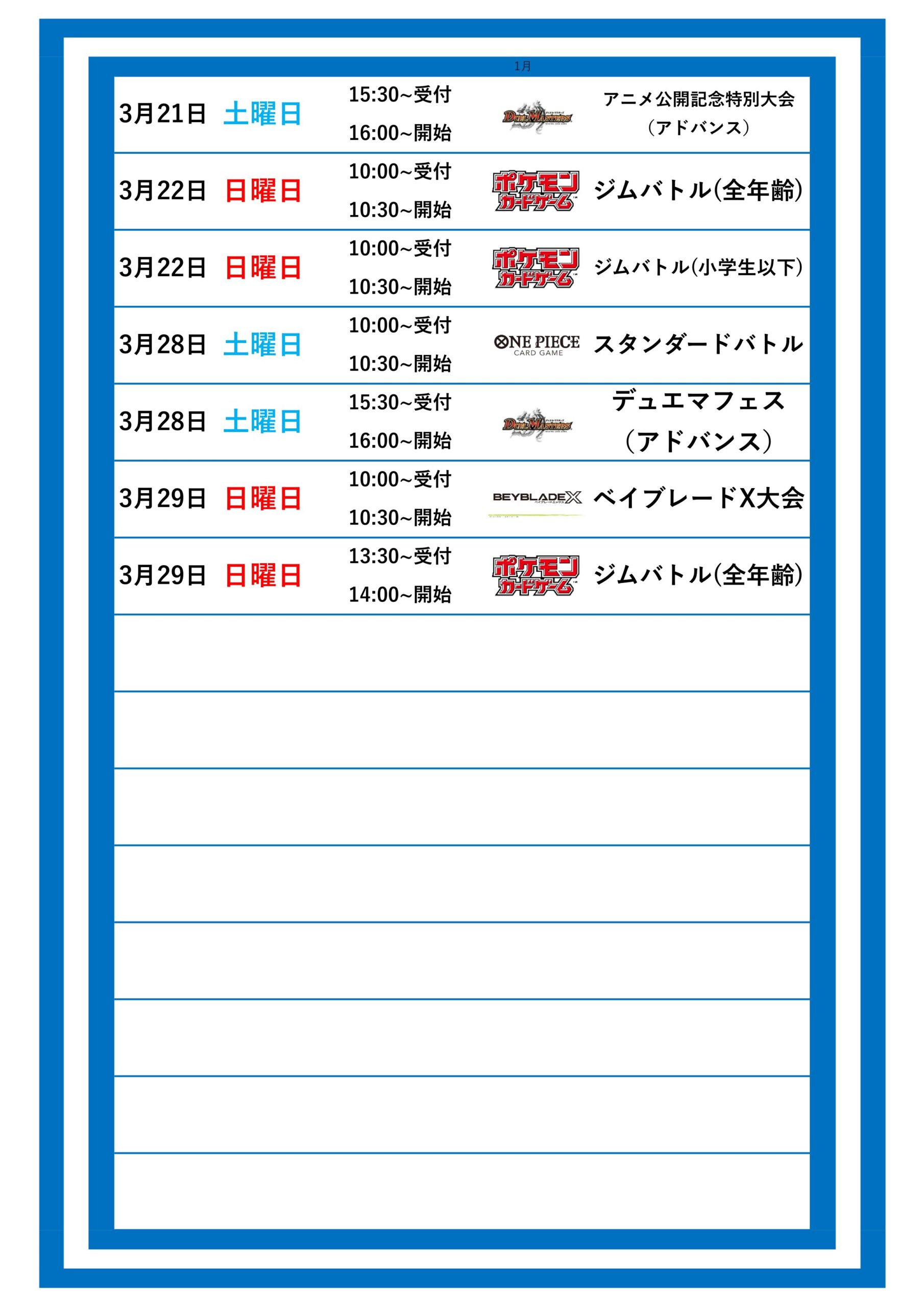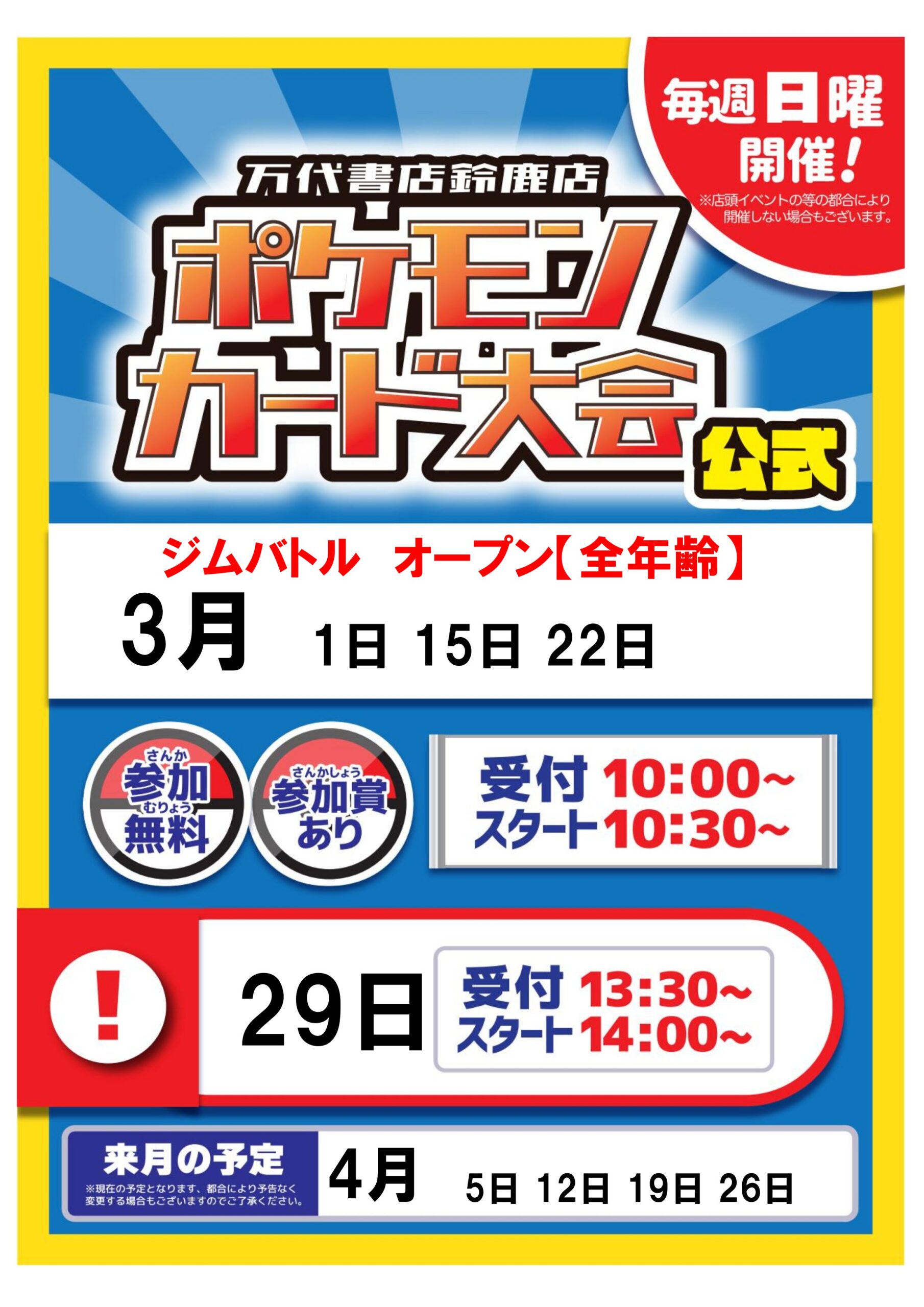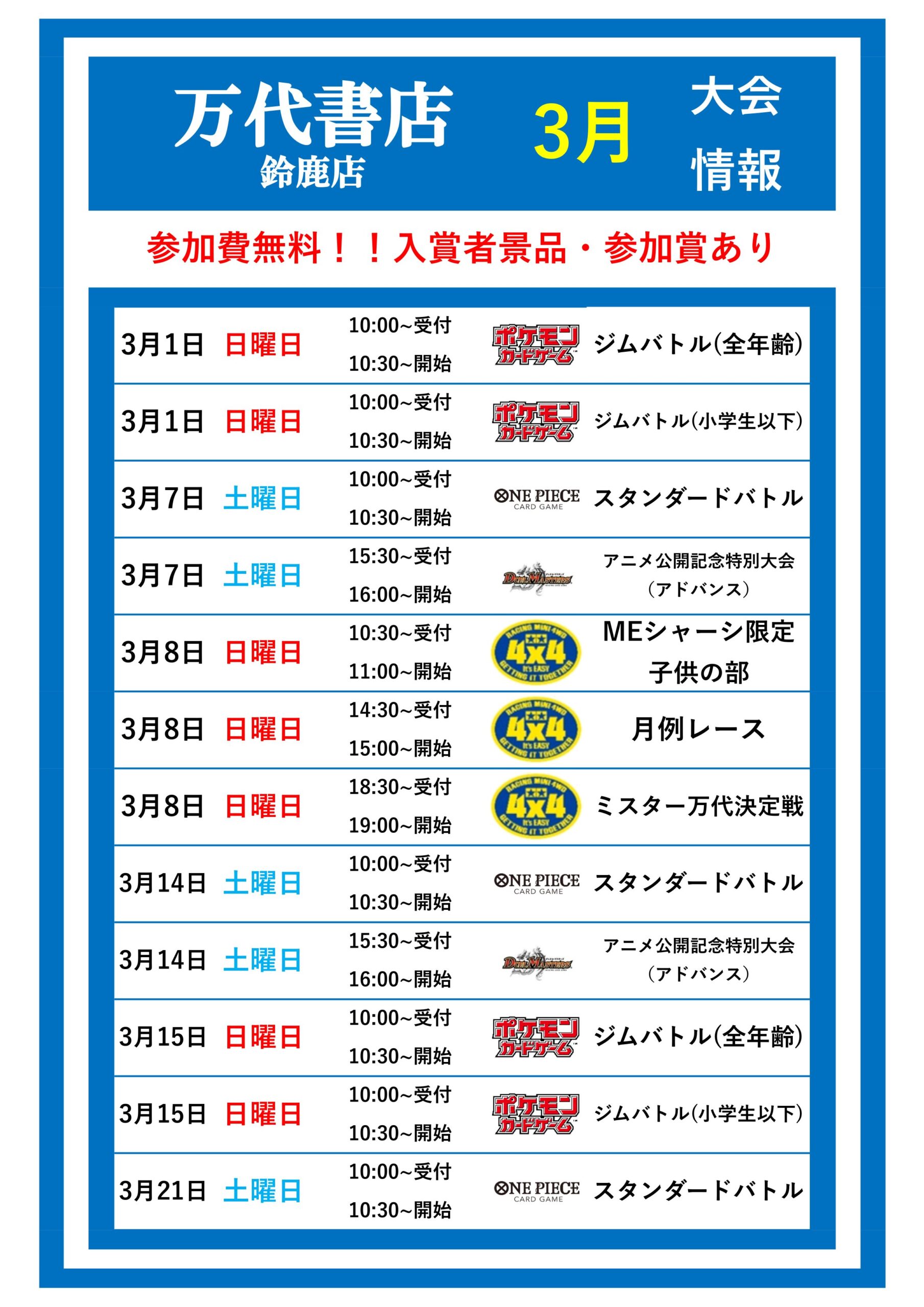 【鈴鹿店】★3月の大会カレンダー★ new 万代書店鈴鹿店 鈴鹿店 イベント情報 鈴鹿店 おもちゃ 鈴鹿店 カード 2026年2月27日 ★3月の大会カレンダー★ **************** こちら↓もぜひチェックしてみてくださいね♪(*´▽`*) ・最新のイベント情報はこちら ・最新の買取情報はこちら