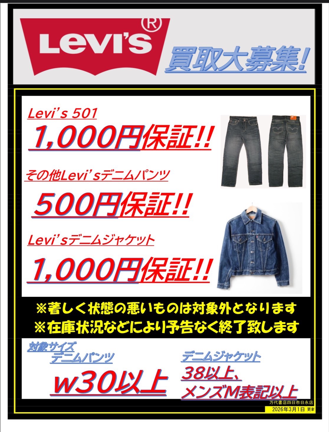 Levi’sデニムパンツ、デニムジャケットの買取告知です👖
