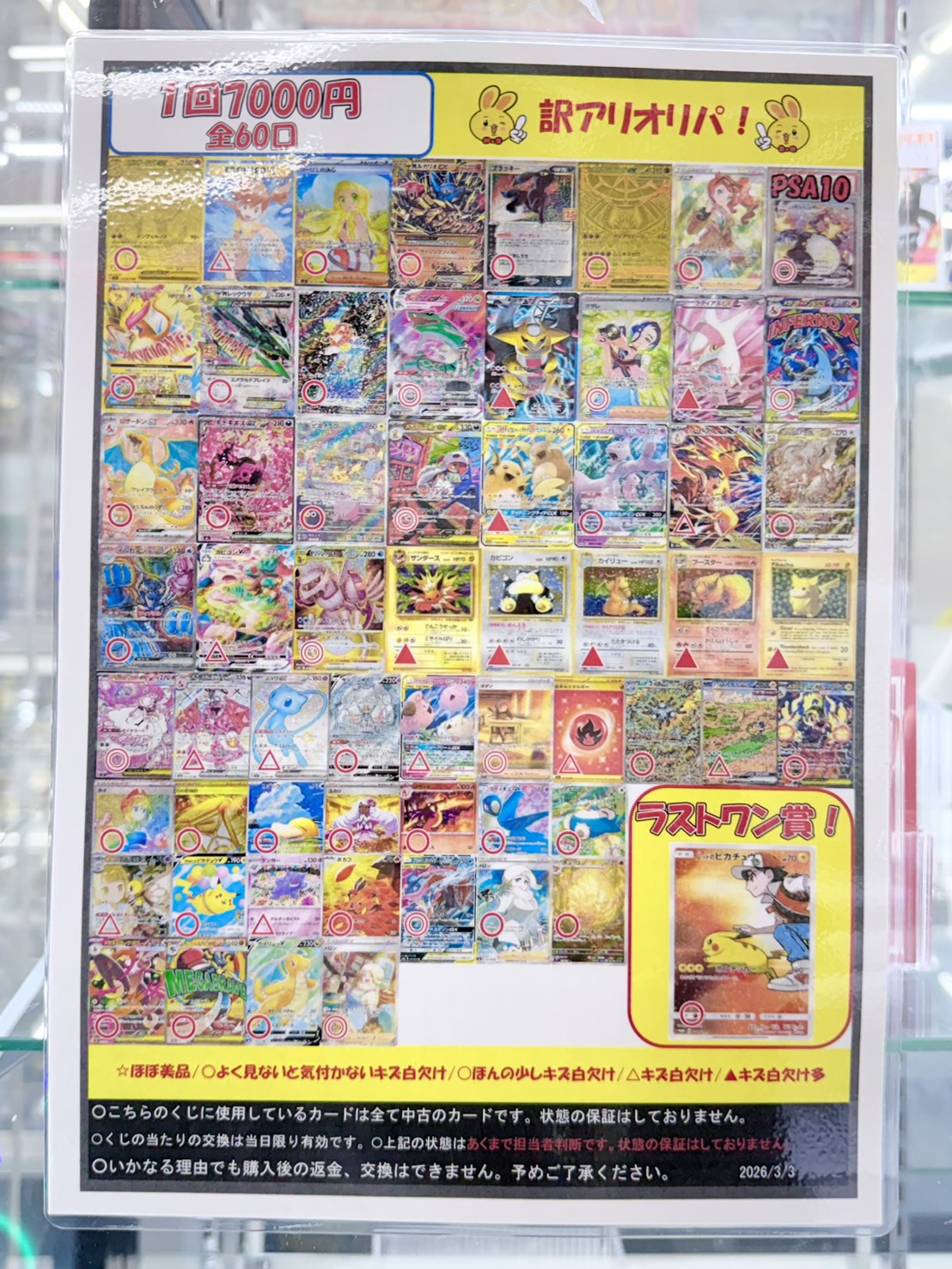 【鈴鹿店】ポケカ訳ありオリパ発売中❕ 万代書店鈴鹿店 鈴鹿店 カード 2026年3月3日 🌸カードコーナーより🌸 ポケカ訳ありオリパ発売中❕ 1回 7000円 全 60口 リザードンMURや、カスミのやる気SR、リーリエの決心SARなどが7000円で当たるチャンスです🌺🦩 ラストワン賞にレッドのピカチュウご用意しております💝