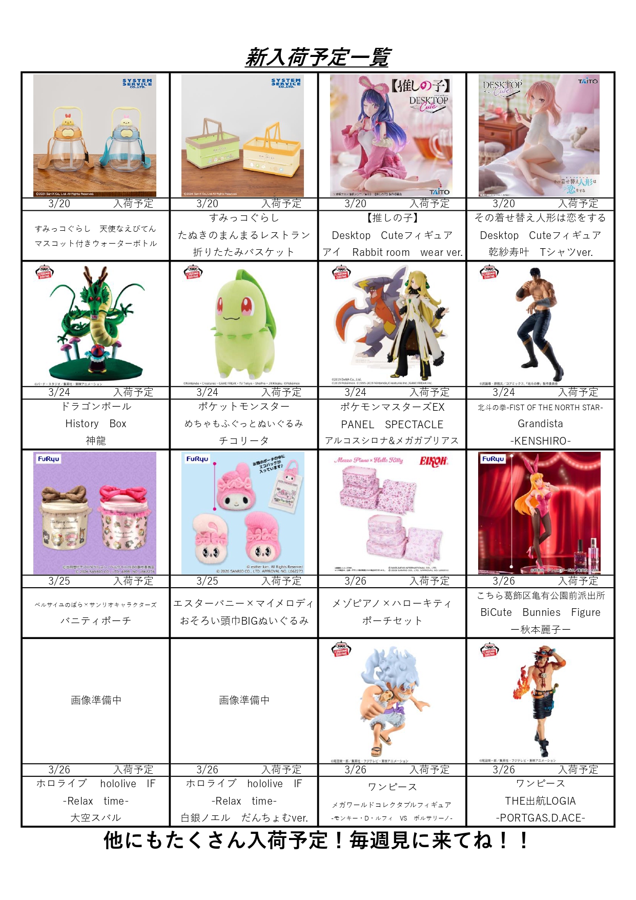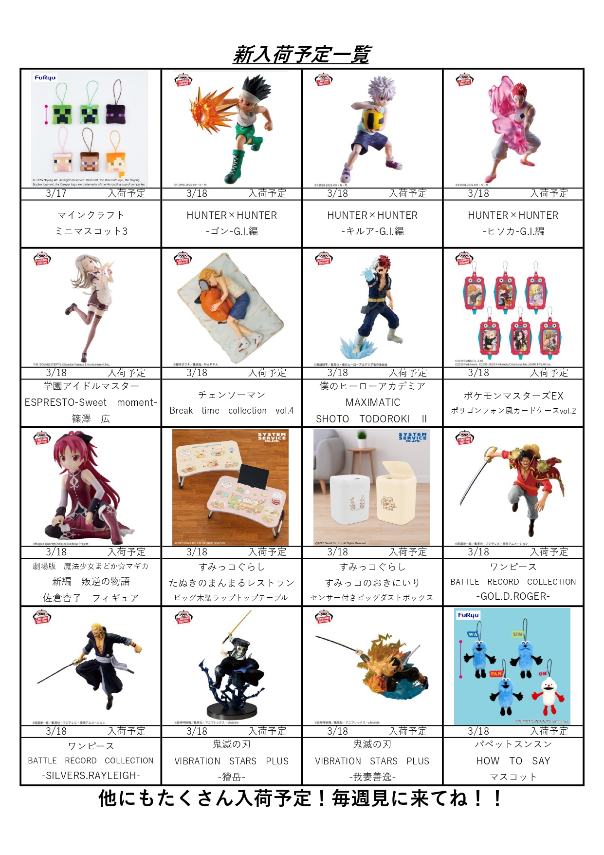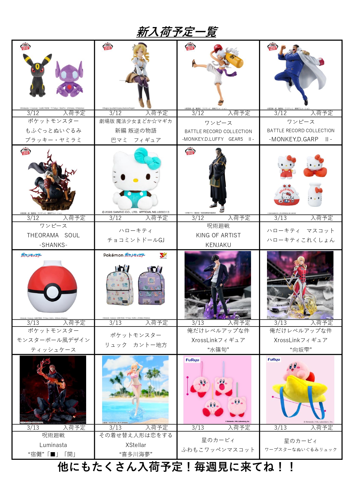 クレーンゲームコーナー3月の入荷予定表です