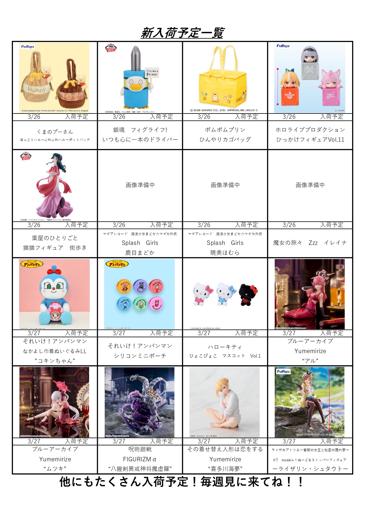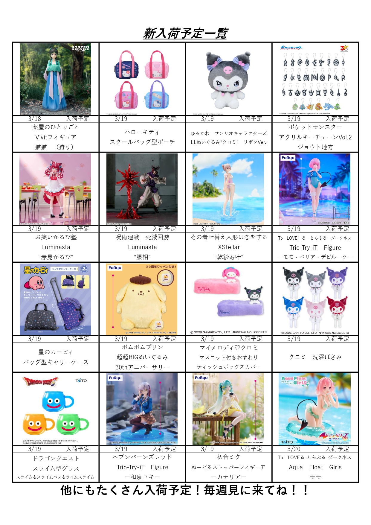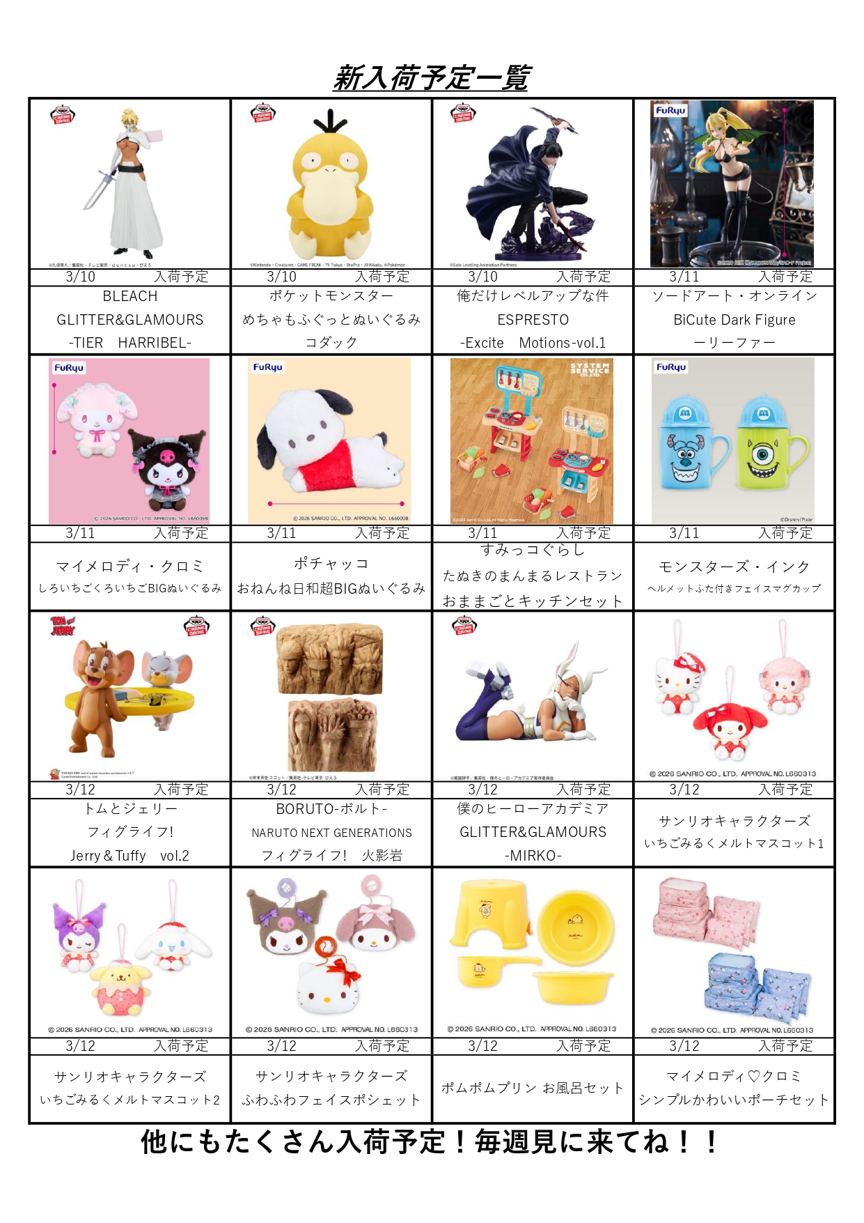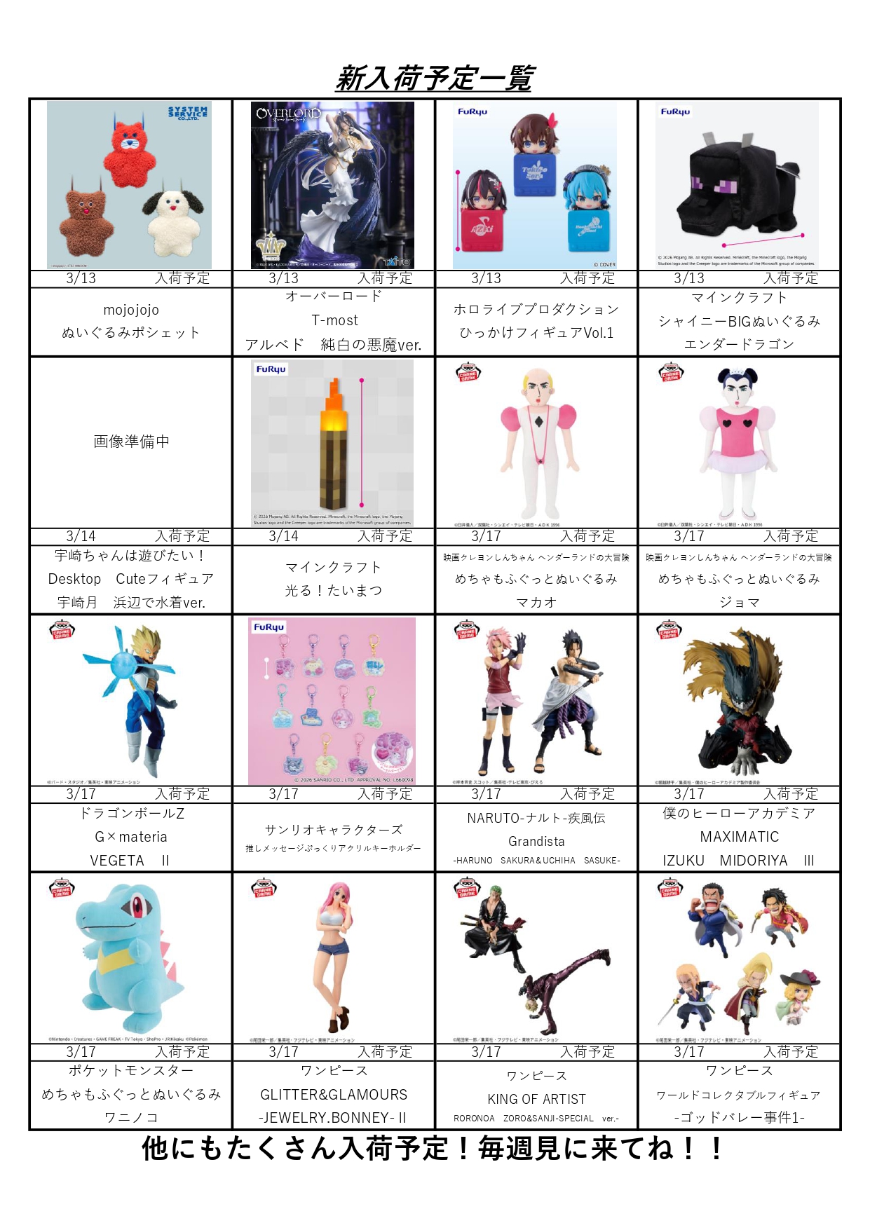 クレーンゲームコーナー3月の入荷予定表です