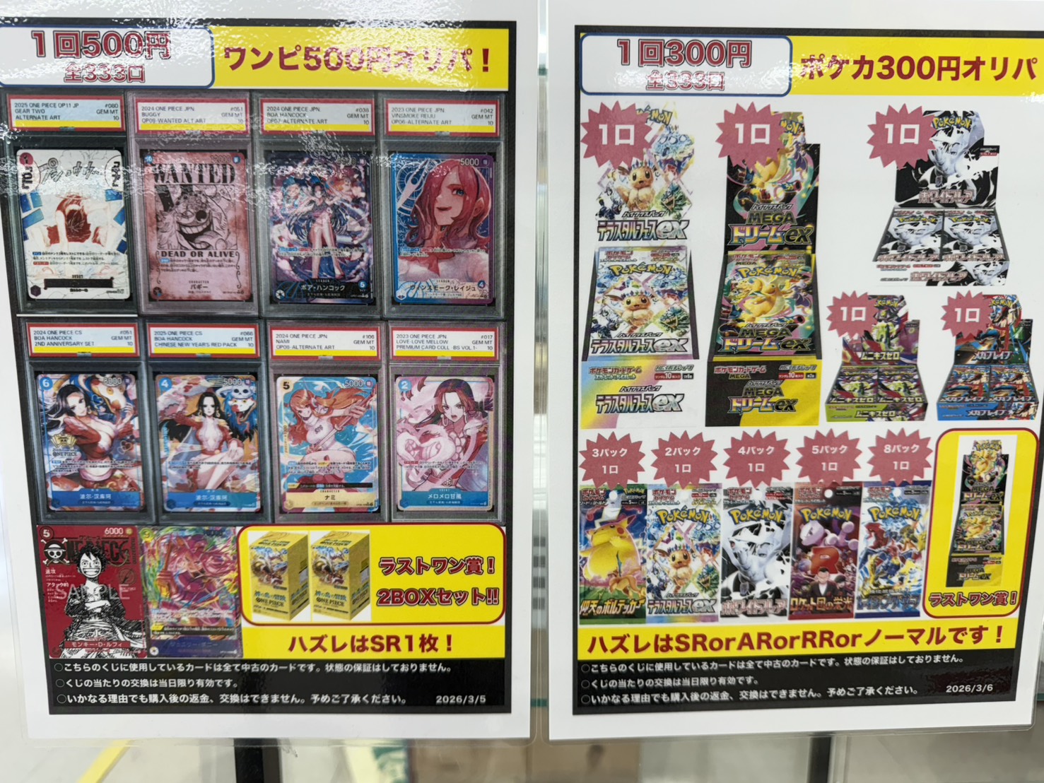 【鈴鹿店】カードコーナーより🐱 オリパ販売情報! 万代書店鈴鹿店 鈴鹿店 カード 2026年3月7日 カードコーナーより🐱! ポケカオリパ発売中! 1回300円 全333口 テラスタルフェスやホワイトフレアなどが当たるチャンス✨ ラストワン賞はMEGAドリームです(*’ω’*)✨ ワンピオリパ発売中! 1回500円 全333口 ルフィやバギーやハンコックのPSA10などが当たるチャンス✨ ラストワン賞は神の島の冒険2BOXセットです(*’ω’*)✨