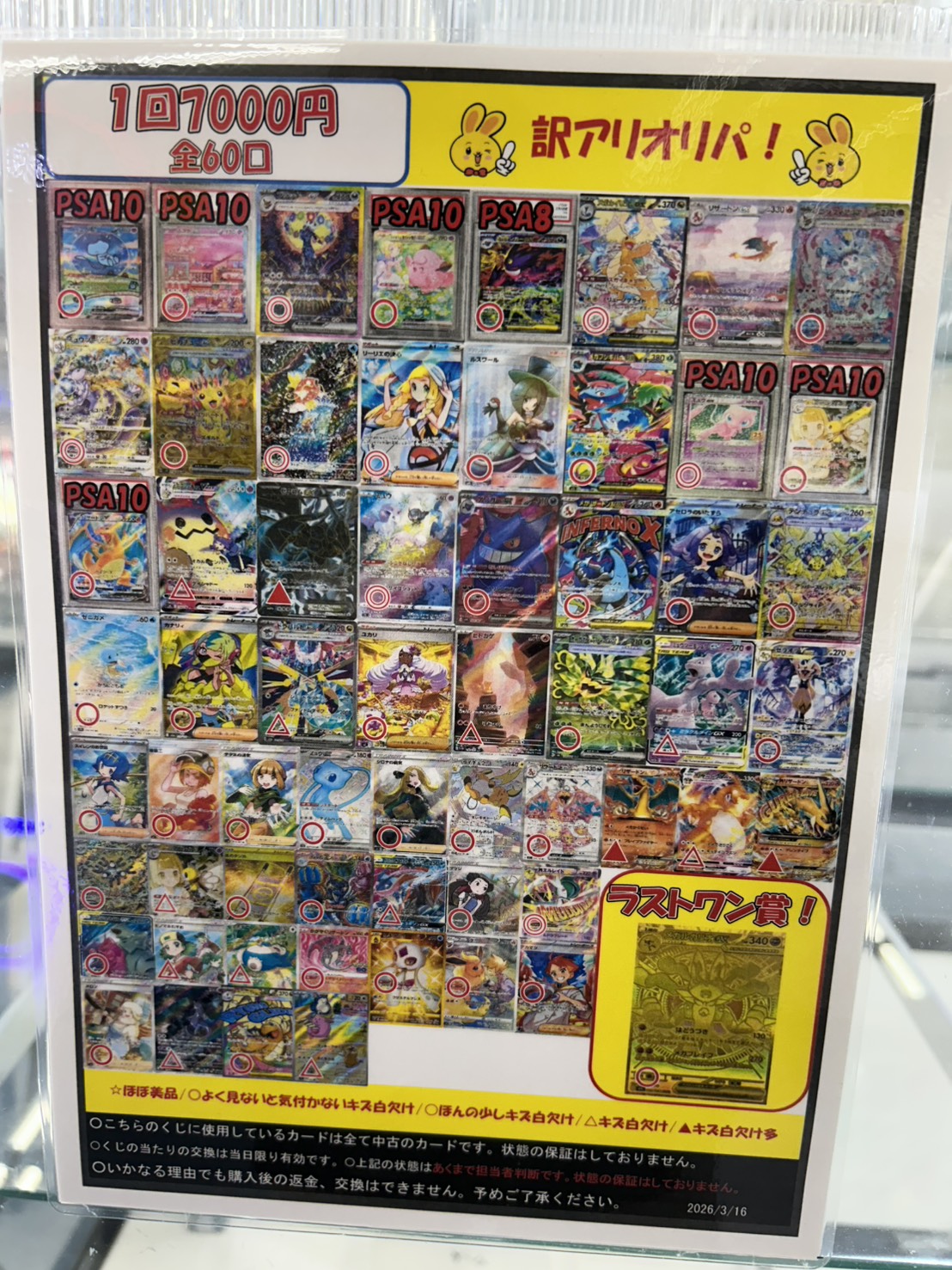 【鈴鹿店】訳ありオリパ発売中! 万代書店鈴鹿店 鈴鹿店 カード 2026年3月16日 カードコーナーより🐱 訳ありオリパ発売中です🙌 1回 7000円 全 60口 ミュウex(347/190) SAR PSA10やミュウex(205/165) SAR PSA10、ブラッキーex SARなどが7000円で当たるチャンスです🌟 ラストワン賞にメガルカリオex MURをご用意しております😍