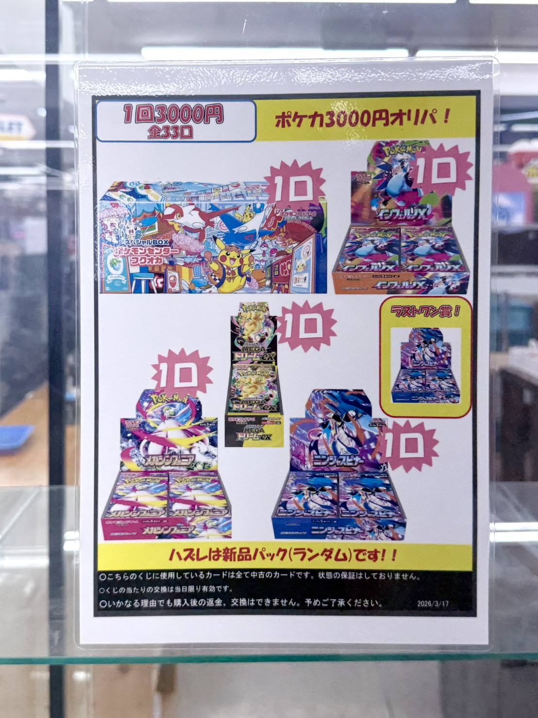 【鈴鹿店】⚛️カードコーナーより⚛️ 3000円オリパ発売中😈 万代書店鈴鹿店 鈴鹿店 カード 2026年3月18日 ⚛️カードコーナーより⚛️ 3000円オリパ発売中😈 1回 3000円 全 33口 フクオカ、インフェルノX、MEGAドリーム、インフェルノ、ニンジャスピナーなどのBOXが3000円で当たるかも👾☔️ ラストワン賞ニンジャスピナー1BOXご用意しております🧞♀️💜