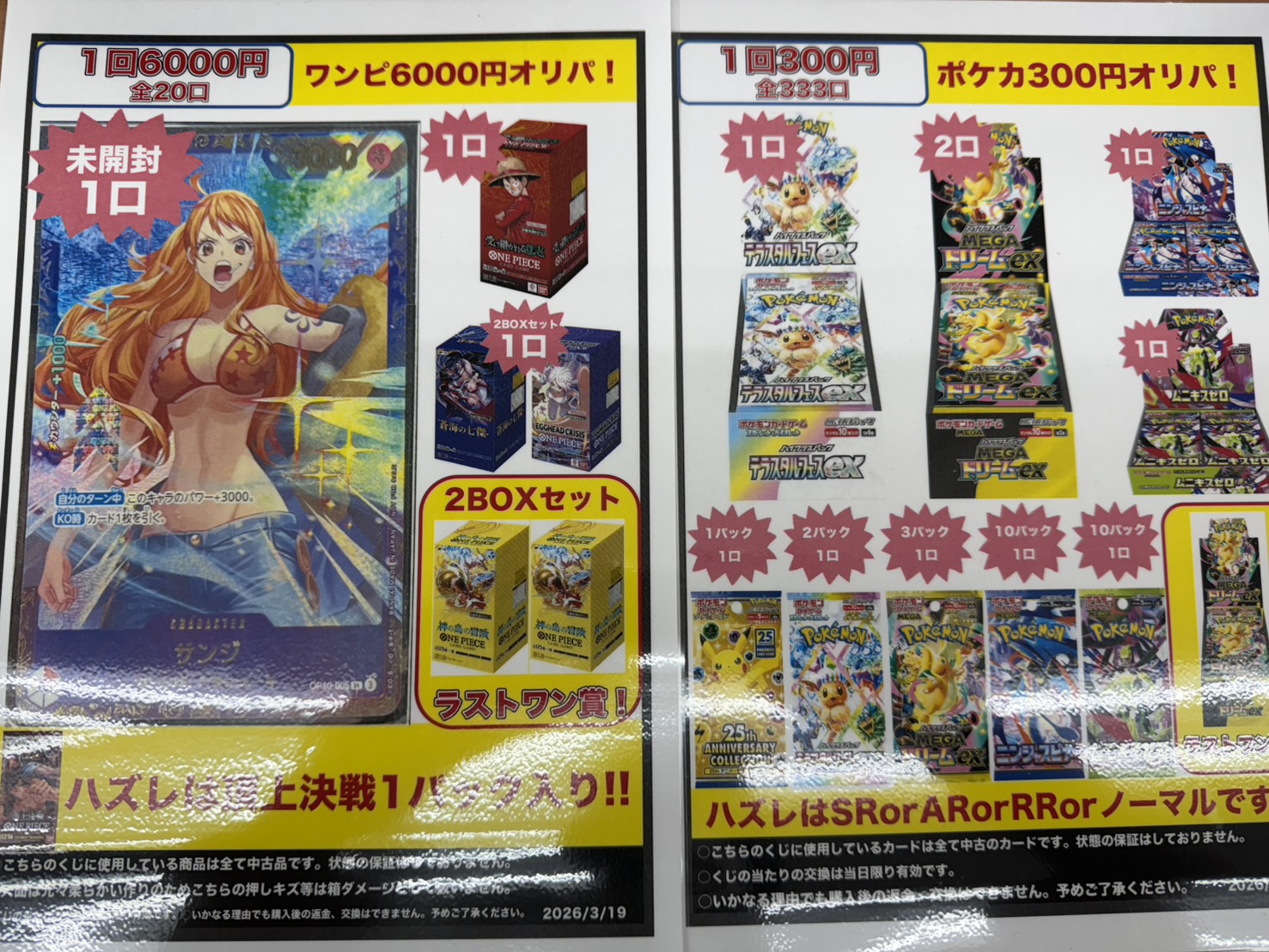 【鈴鹿店】📰カードコーナーより📰 ポケカ300円│ワンピ6000円オリパ発売中! 万代書店鈴鹿店 鈴鹿店 カード 2026年3月20日 📰カードコーナーより📰 ポケカ300円オリパ発売中! 1回300円全333口 テラスタルフェスやMEGAドリームなどが当たります! ラストワン賞はMEGAドリーム1BOXです! ワンピ6000円オリパ発売中! 1回6000円全20口 サンジや受け継がれる意志のBOXが当たります! ハズレは頂上決戦のパックです! ラストワン賞は神の島の冒険2BOXです!