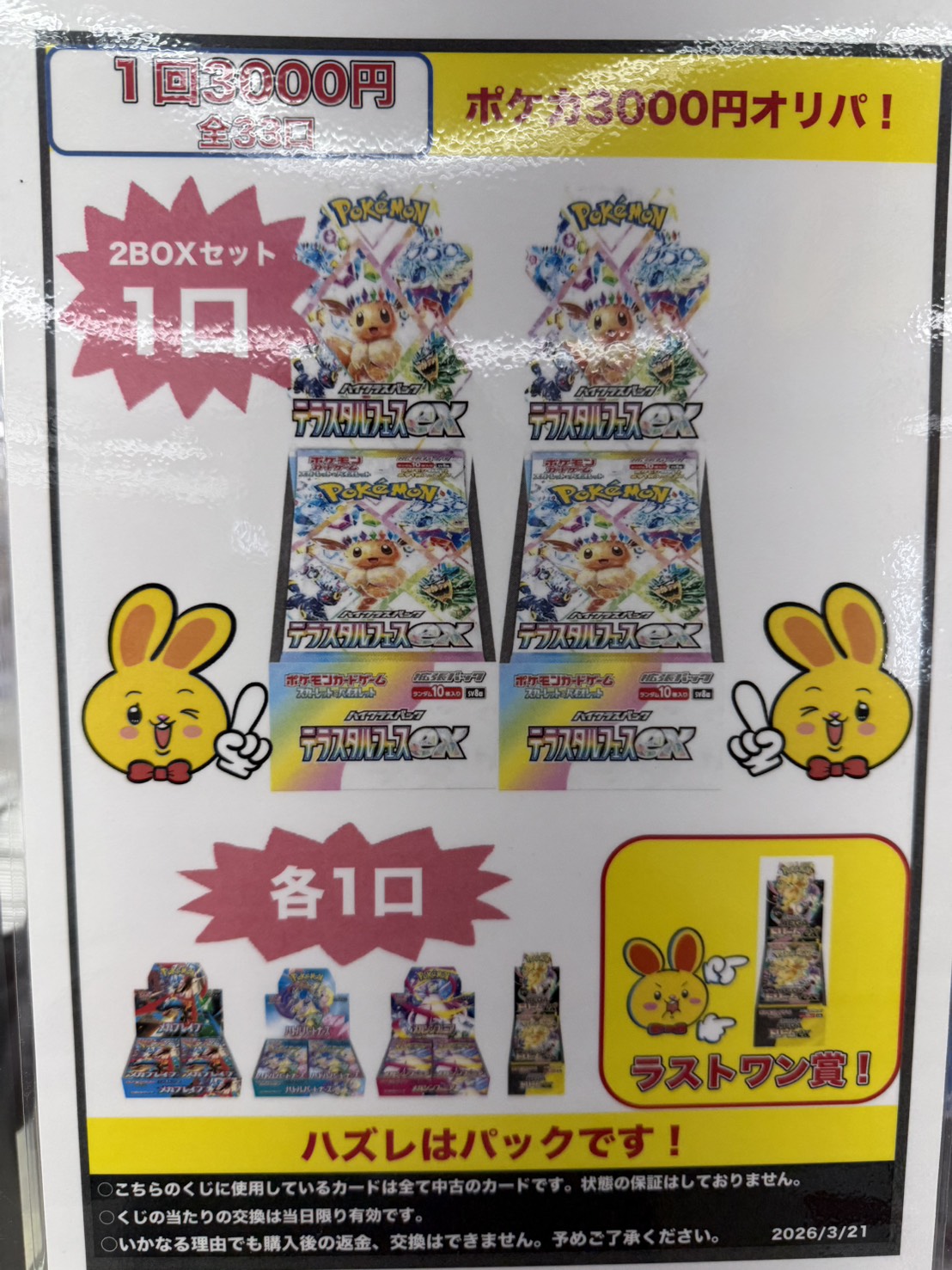【鈴鹿店】📰カードコーナーより📰 ポケカ3000円オリパ発売中! 万代書店鈴鹿店 鈴鹿店 カード 2026年3月21日 📰カードコーナーより📰 ポケカ3000円オリパ発売中! 1回3000円全33口 テラスタルフェス2BOXセットやMEGAドリームなどが当たります! ラストワン賞はMEGAドリーム!