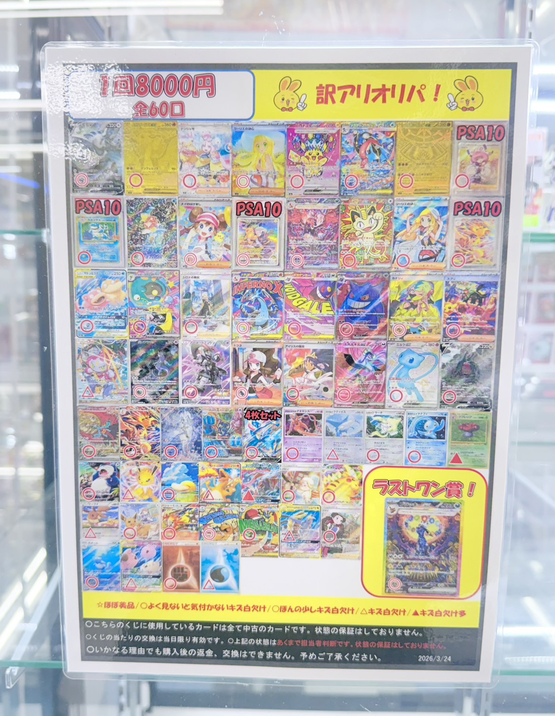【鈴鹿店】訳ありオリパ発売中! 万代書店鈴鹿店 鈴鹿店 カード 2026年3月25日 🐰カードコーナーより🐰 訳ありオリパ発売中❕ 1回8000円 全60口 ルギアVや、リザードン MUR、ナンジャモSAR、リーリエの決心SARなどが8000円で当たるチャンスです🕊️🤍 ラストワン賞にブラッキーSARご用意しておりますので皆様の挑戦お待ちしております⛅️💌