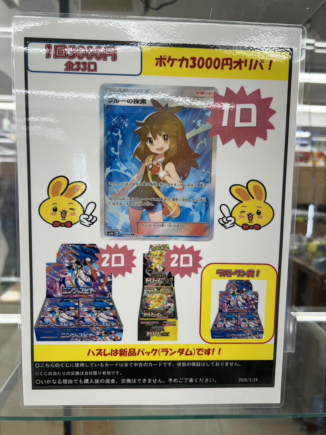 【鈴鹿店】ポケカ3000円オリパ発売中! 万代書店鈴鹿店 鈴鹿店 カード 2026年3月27日 📰カードコーナーより📰 ポケカ3000円オリパ発売中! 1回3000円全33口 ブルーの探索 SRやニンジャスピナーなどが当たります! ラストワン賞はニンジャスピナー1BOX!