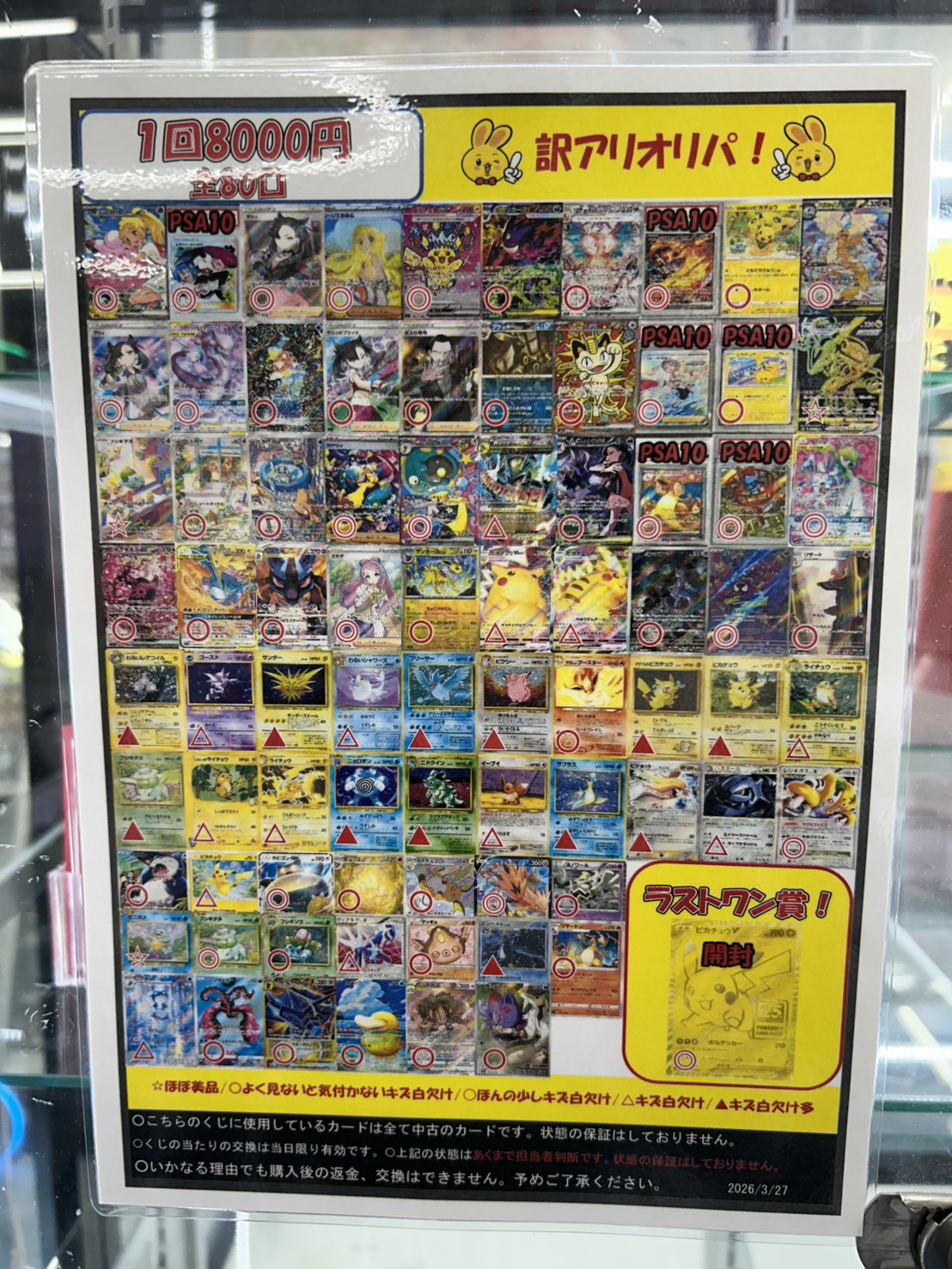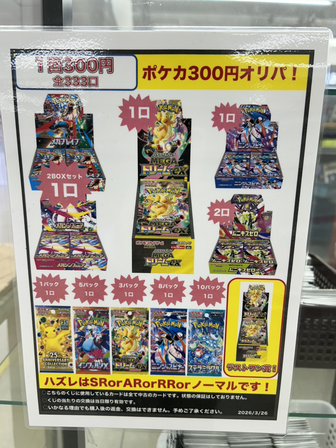 【鈴鹿店】オリパ発売中です🙌 万代書店鈴鹿店 鈴鹿店 カード 2026年3月27日 カードコーナーより💫 訳ありオリパ発売中です🙌 1回 8000円 全 80口 リーリエのピッピex(SAR仕様)やムサシとコジロウ SR PSA10、マリィ SRなどが8000円で当たるチャンスです🌟 ラストワン賞にピカチュウV(開封)をご用意しております💖💫 ポケカ300円オリパ発売中! 1回300円 全333口 メガブレイブ&メガシンフォニア2BOXセットやニンジャスピナーBOX、未開封パックなどが300円で当たるチャンス✨ ラストワン賞はMEGAドリーム1BOXです(*’ω’*)✨