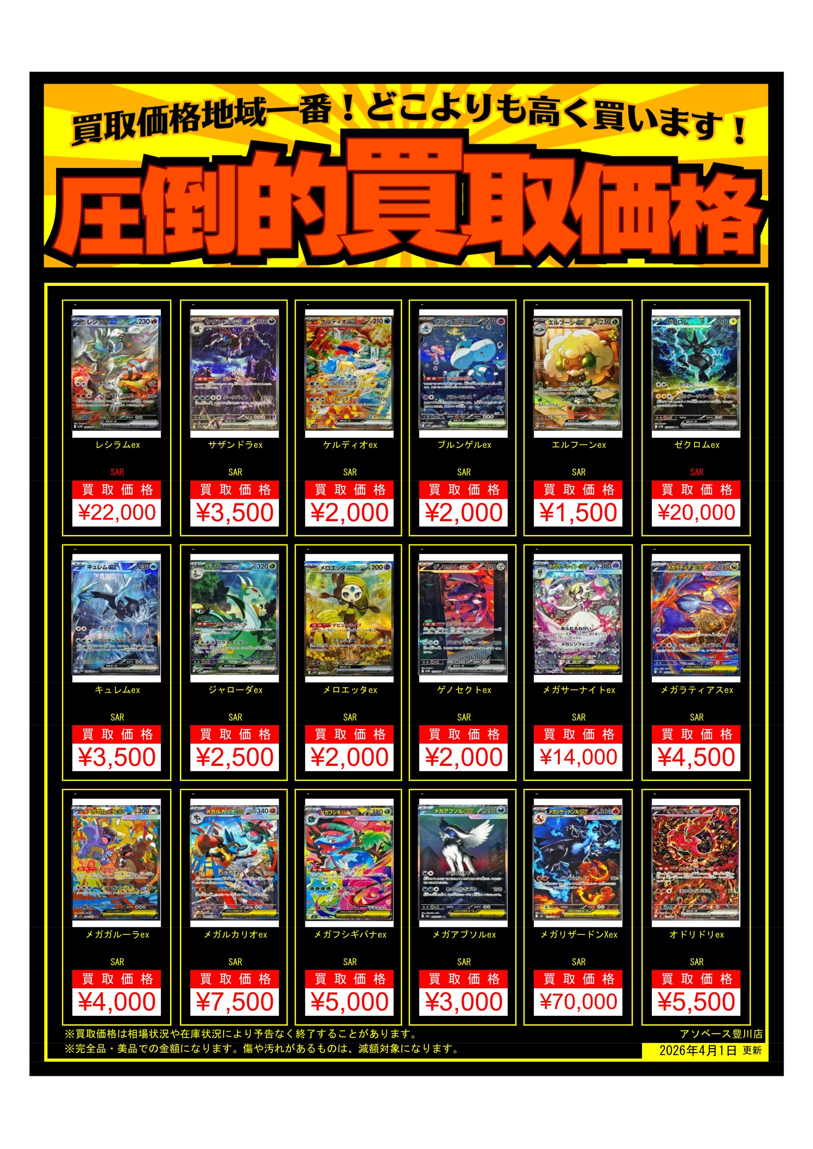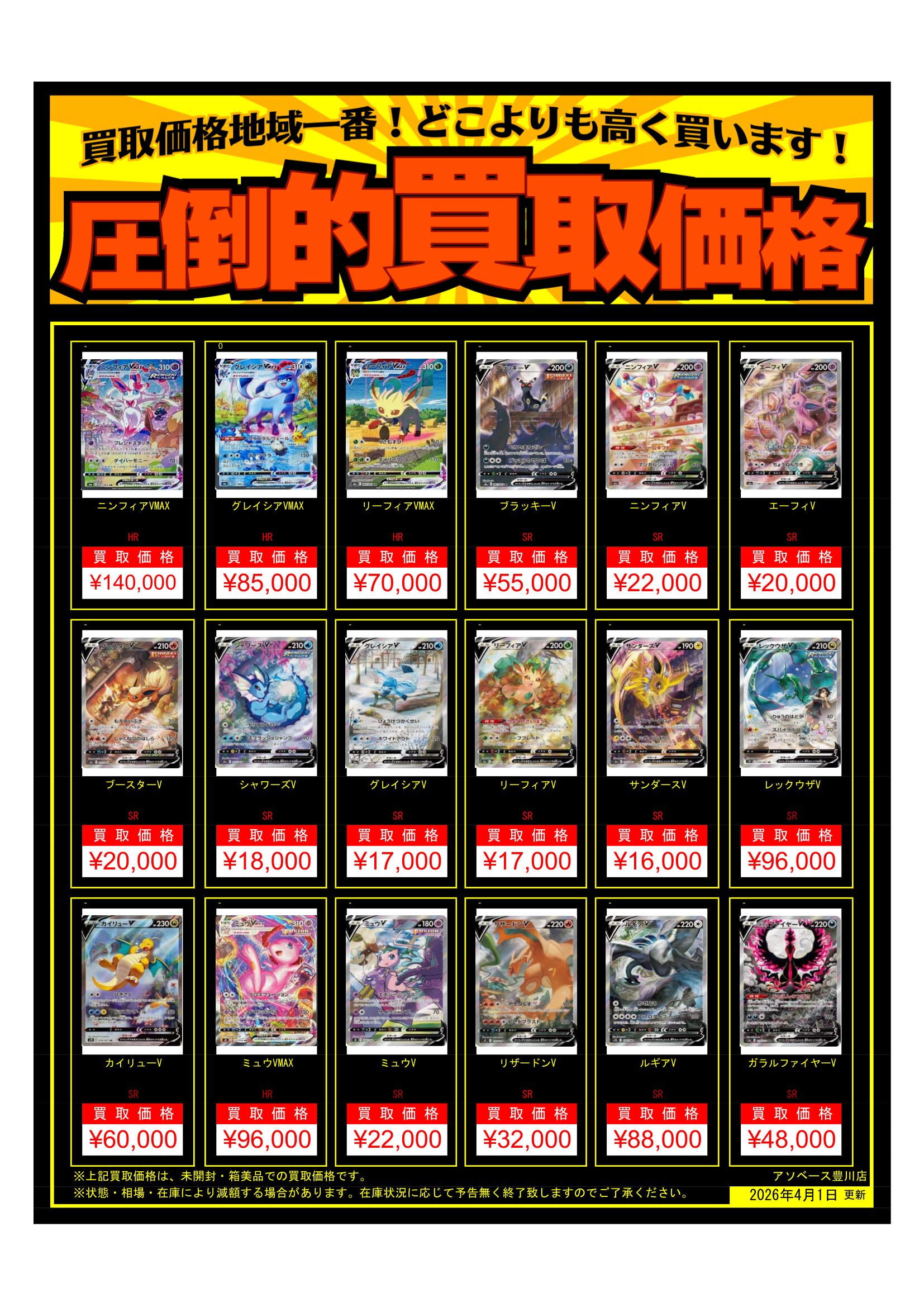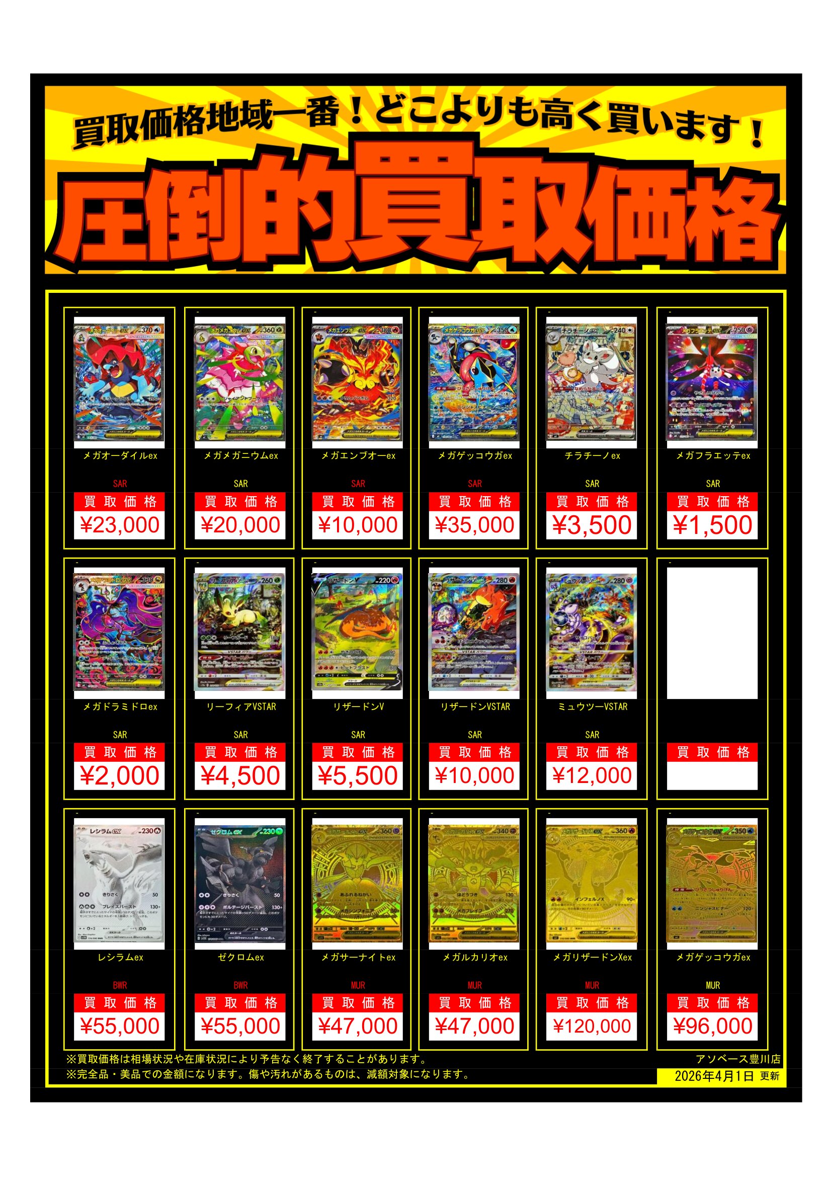【アソベース豊川店】ポケモンカード買取告知更新しました! new アソベース豊川店 豊川店 買取情報 豊川店 カード 2026年4月1日 ポケモンカード買取告知更新しました! ※2026/4/1現在の価格となります。 在庫状況・状態によってお値段が変動いたします。予めご了承ください。 **************** こちら↓もぜひチェックしてみてくださいね♪(*´▽`*) ・最新のイベント情報はこちら ・最新の買取情報はこちら
