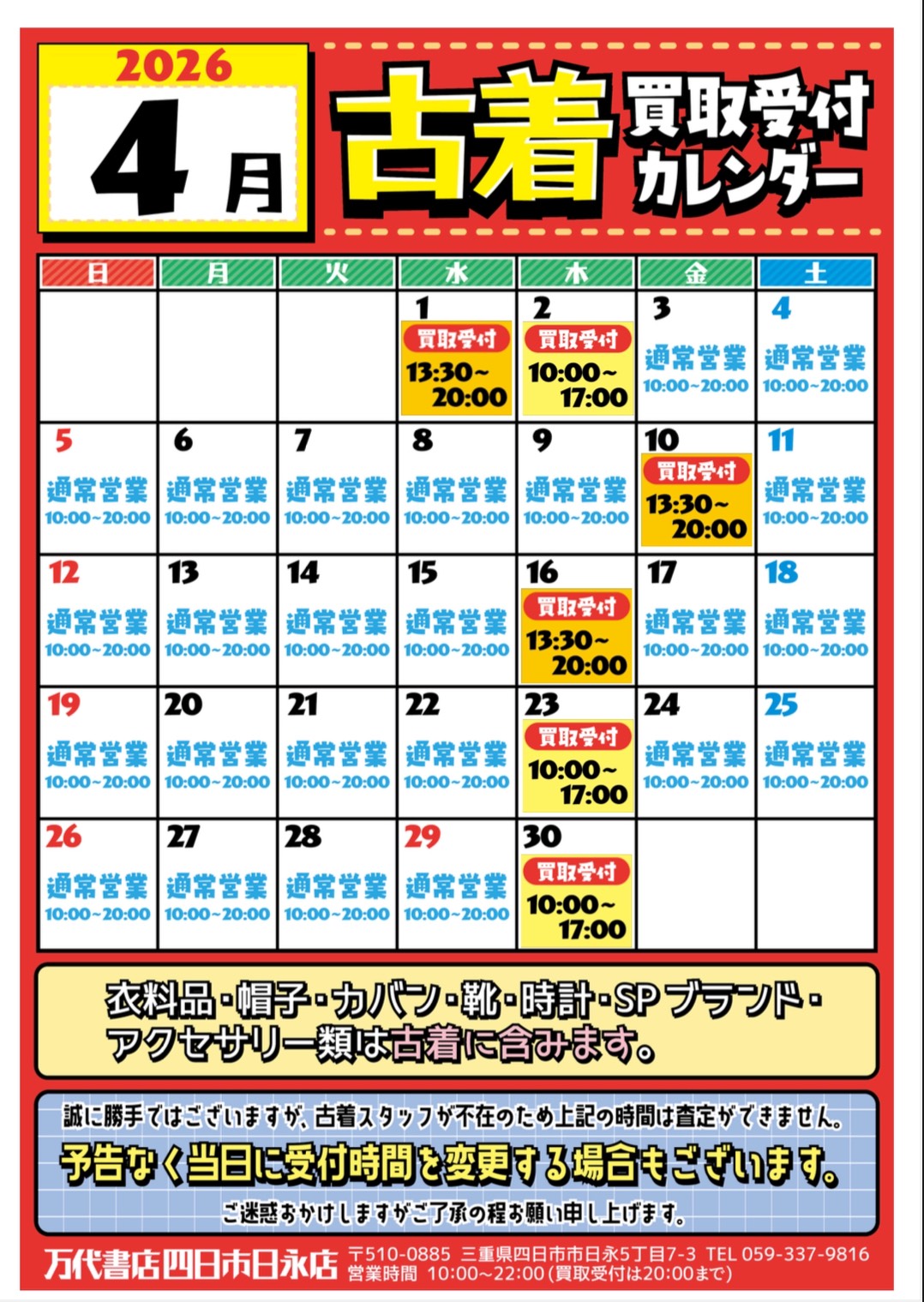 【四日市日永店】★4月古着買取カレンダーとなります☺️★ new 万代書店四日市日永店 四日市日永店 買取情報 四日市日永店 ファッション 2026年4月3日 万代書店四日市日永店 遅くなって申し訳ございません🙇 4月古着買取カレンダーとなります☺️ 今月もたくさんのお持ち込みお待ちしております♪ **************** こちら↓もぜひチェックしてみてくださいね♪(*´▽`*) ・最新のイベント情報はこちら ・最新の買取情報はこちら