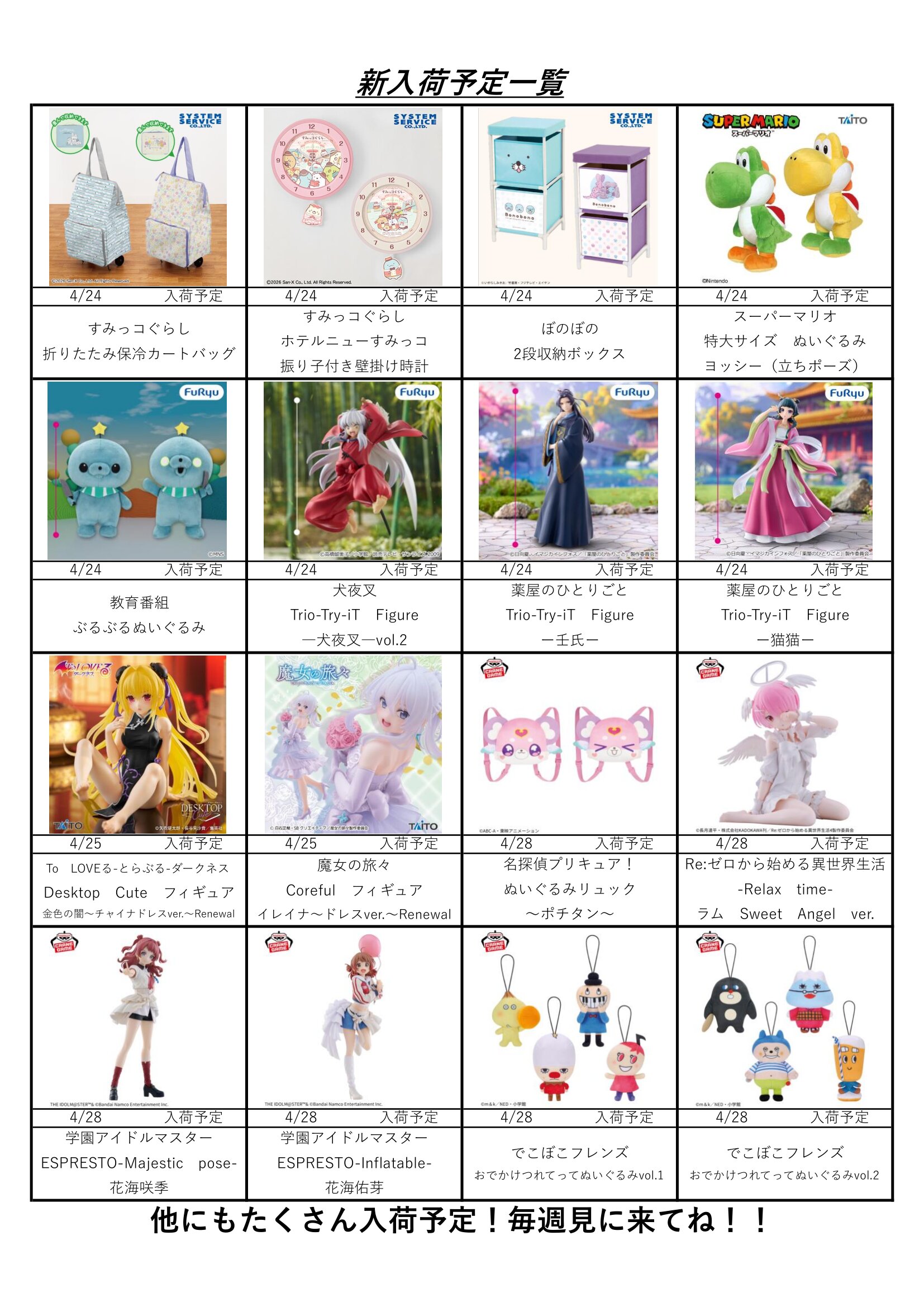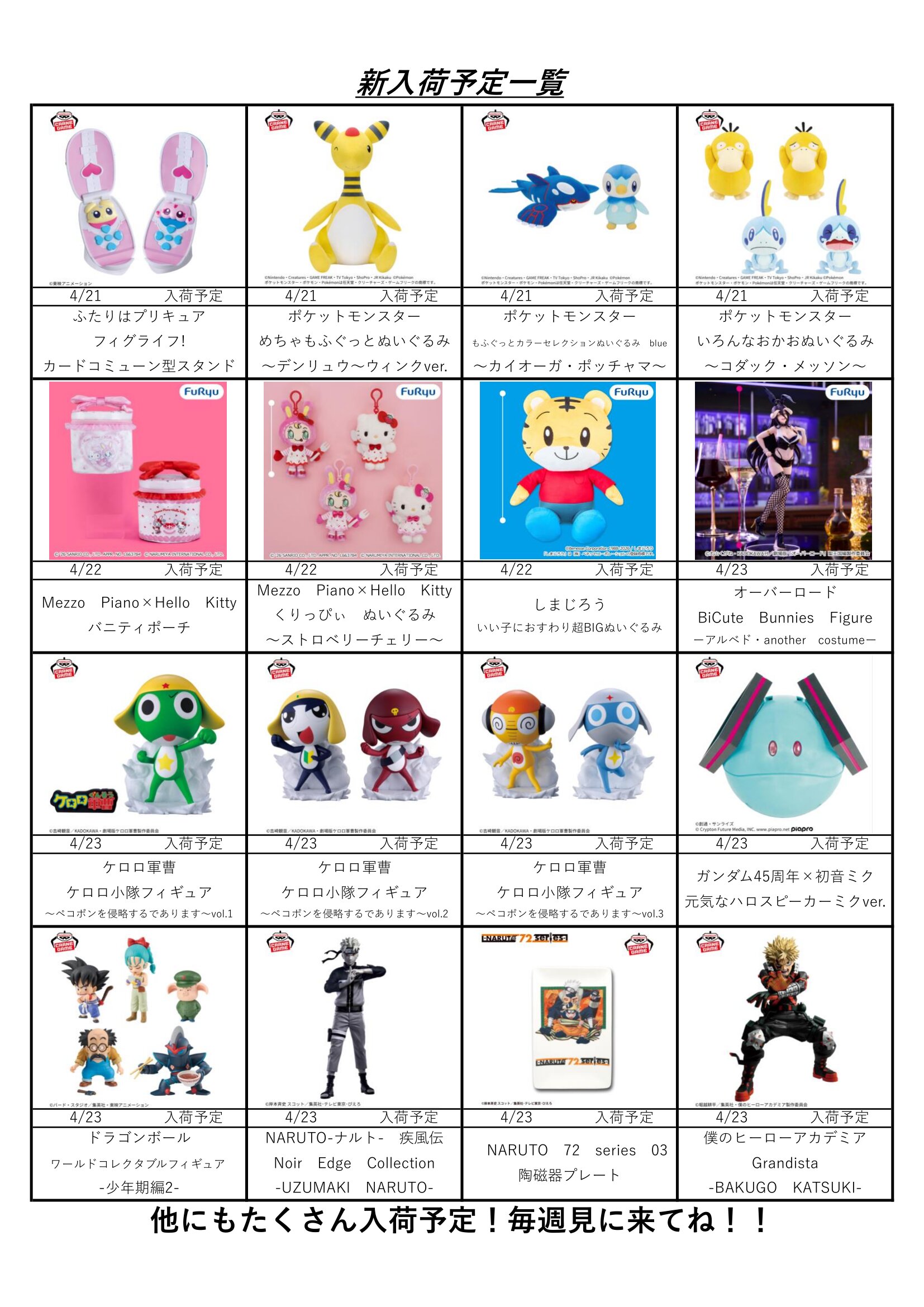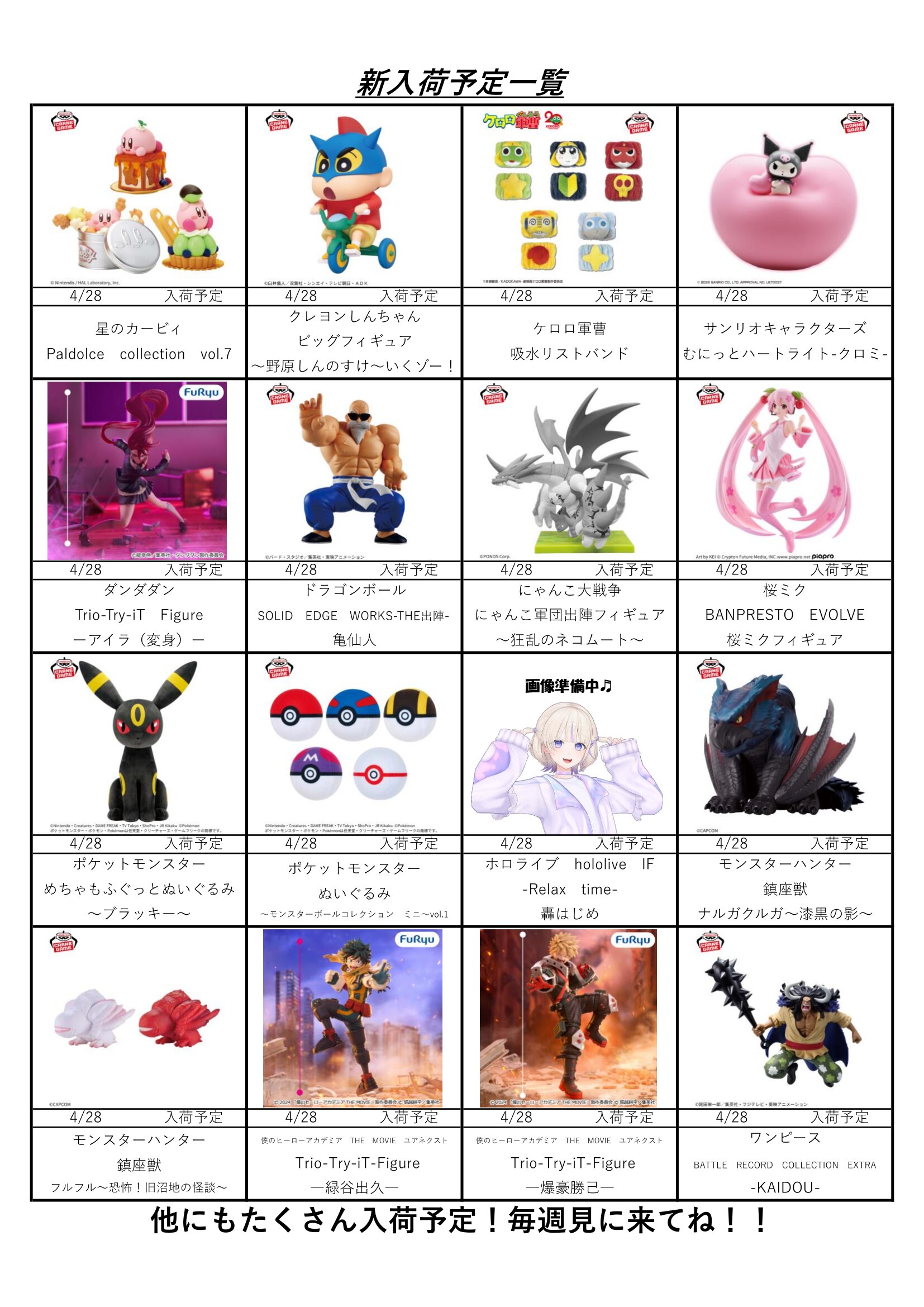 クレーンゲームコーナー4月の入荷予定表です!