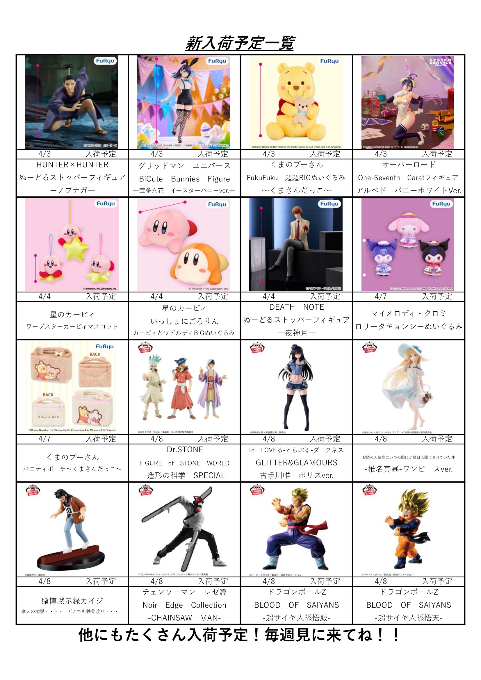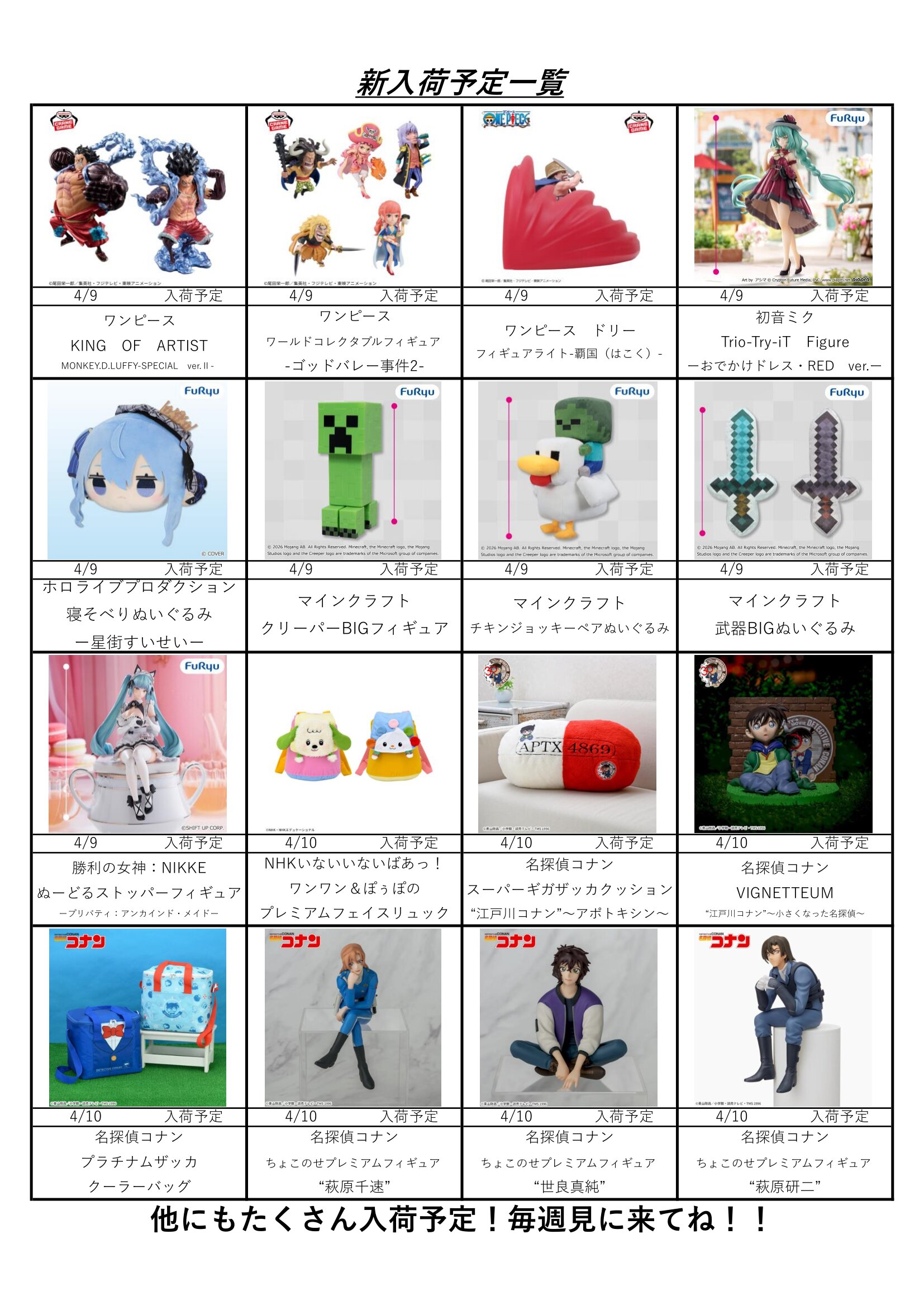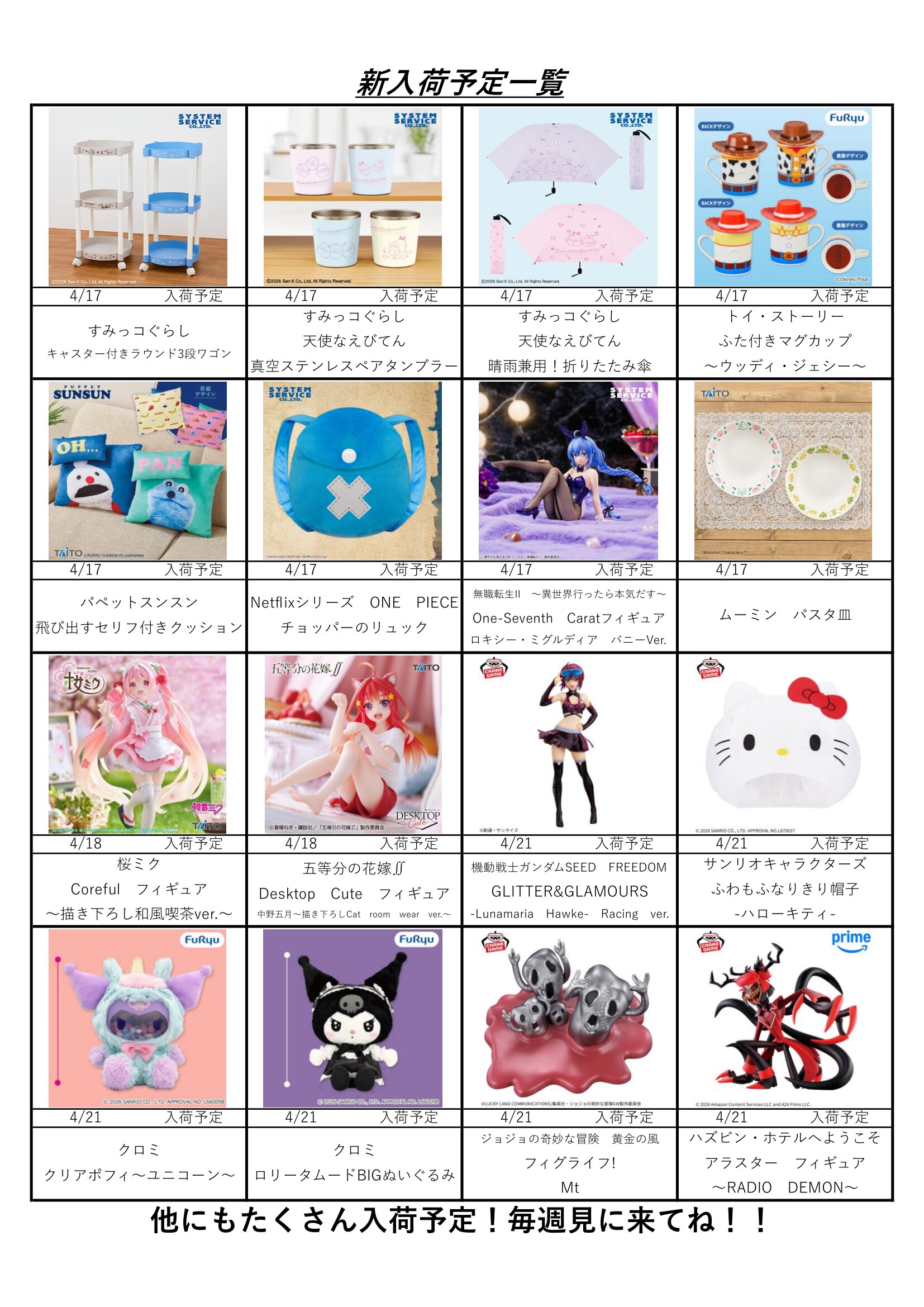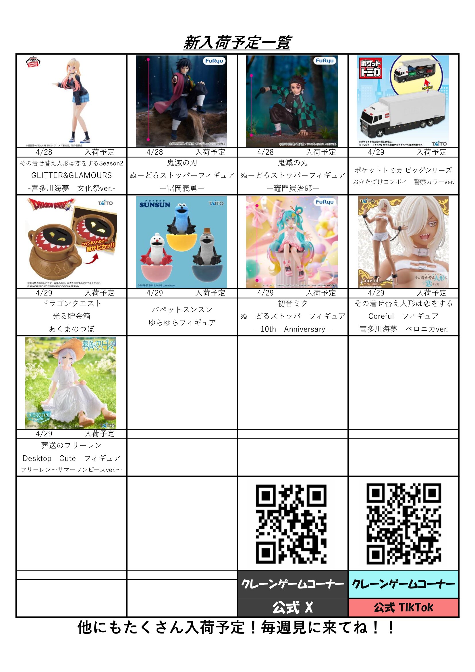 クレーンゲームコーナー4月の入荷予定表です!