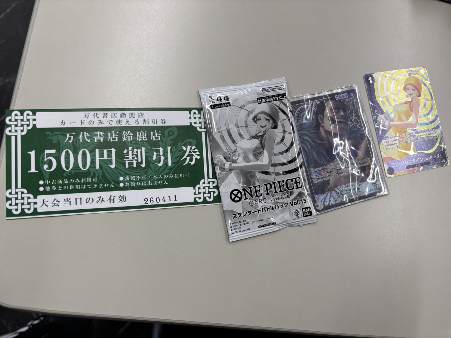 【鈴鹿店】ワンピースカードゲーム大会結果報告! 万代書店鈴鹿店 鈴鹿店 イベント情報 鈴鹿店 カード 2026年4月11日 ワンピースカードゲーム大会結果報告! 本日のワンピースカードゲームスタンダードバトルは12名の方に参加していただきました! 優勝は めねふゆ さん 黒コダイル 優勝おめでとうございます♪ 次回は4/18(土)の開催です