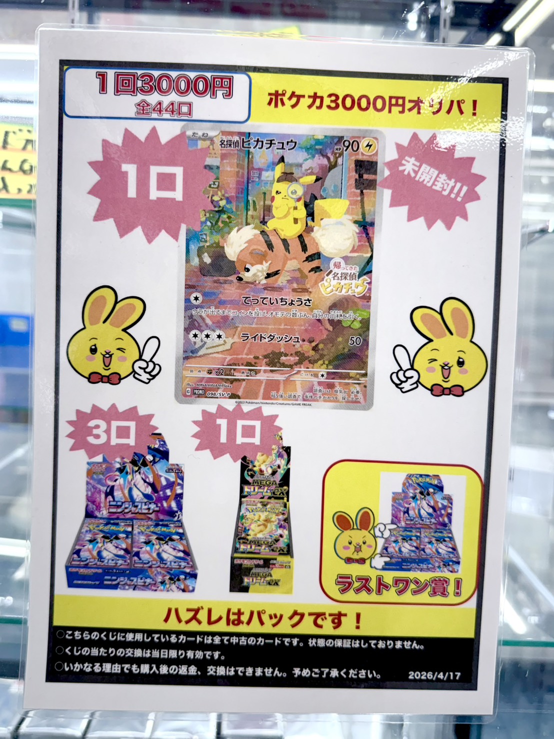 【鈴鹿店】🌼カードコーナーより🌼 ポケカ3000円オリパ発売中🦁 万代書店鈴鹿店 鈴鹿店 カード 2026年4月18日 🌼カードコーナーより🌼 ポケカ3000円オリパ発売中🦁 1回 3000円 全 44口 名探偵のピカチュウ未開封品や、ニンジャスピナー、MEGAドリームのBOXが3000円で当たるチャンスです✨ ラストワン賞ニンジャスピナーご用意しております🎗️☀️