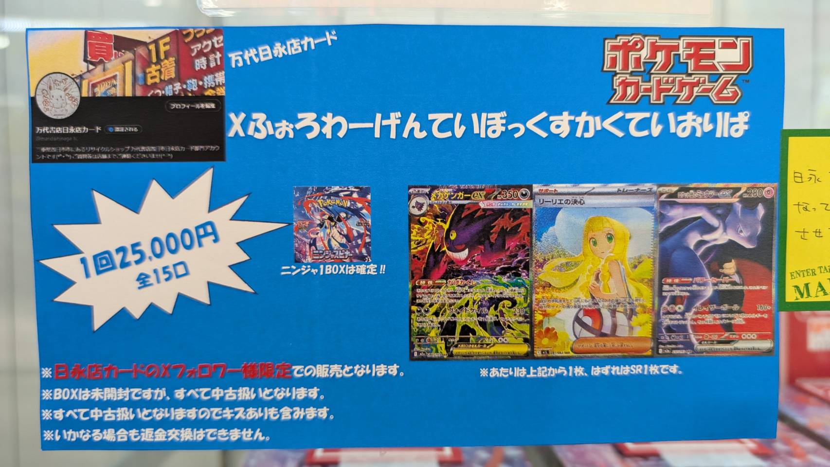 【四日市日永店】カード 一回25000円 Xふぉろわーげんていぼっくすかくていおりぱ 万代書店四日市日永店 四日市日永店 カード 2026年4月19日 カード 一回25000円 Xふぉろわーげんていぼっくすかくていおりぱ 日永カードのX(@mandaihinaga_tc) のフォロワー様限定でひけるオリパです🌺 ニンジャスピナー1BOXは確定! 当たりはニンジャ+記載のカードからどれか1枚🌺 はずれはニンジャ+SR1枚🌺 はずれてもBOXからいいの出るかも…!? まだフォローしてない方はぜひフォローして 挑戦してみてください🫶