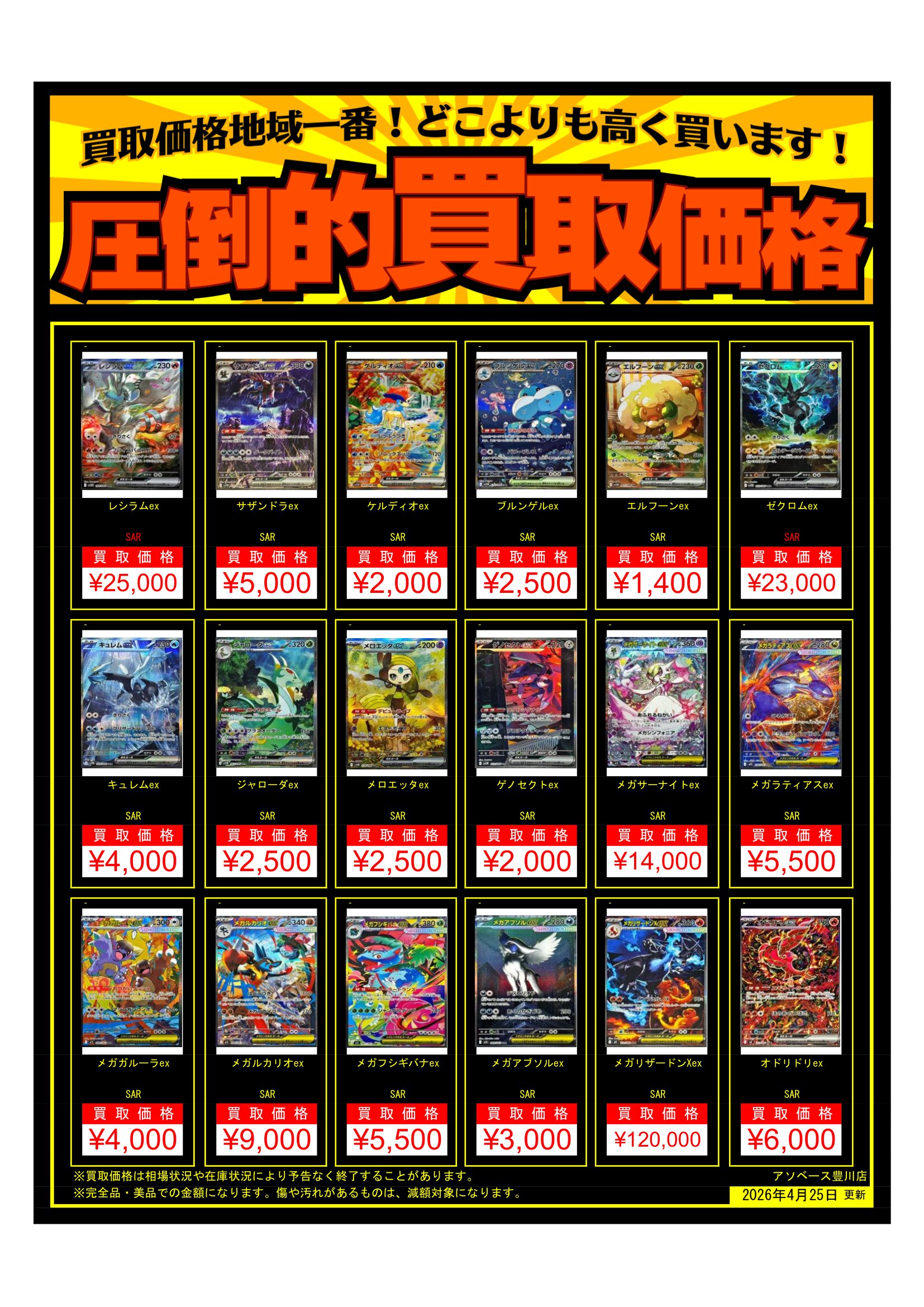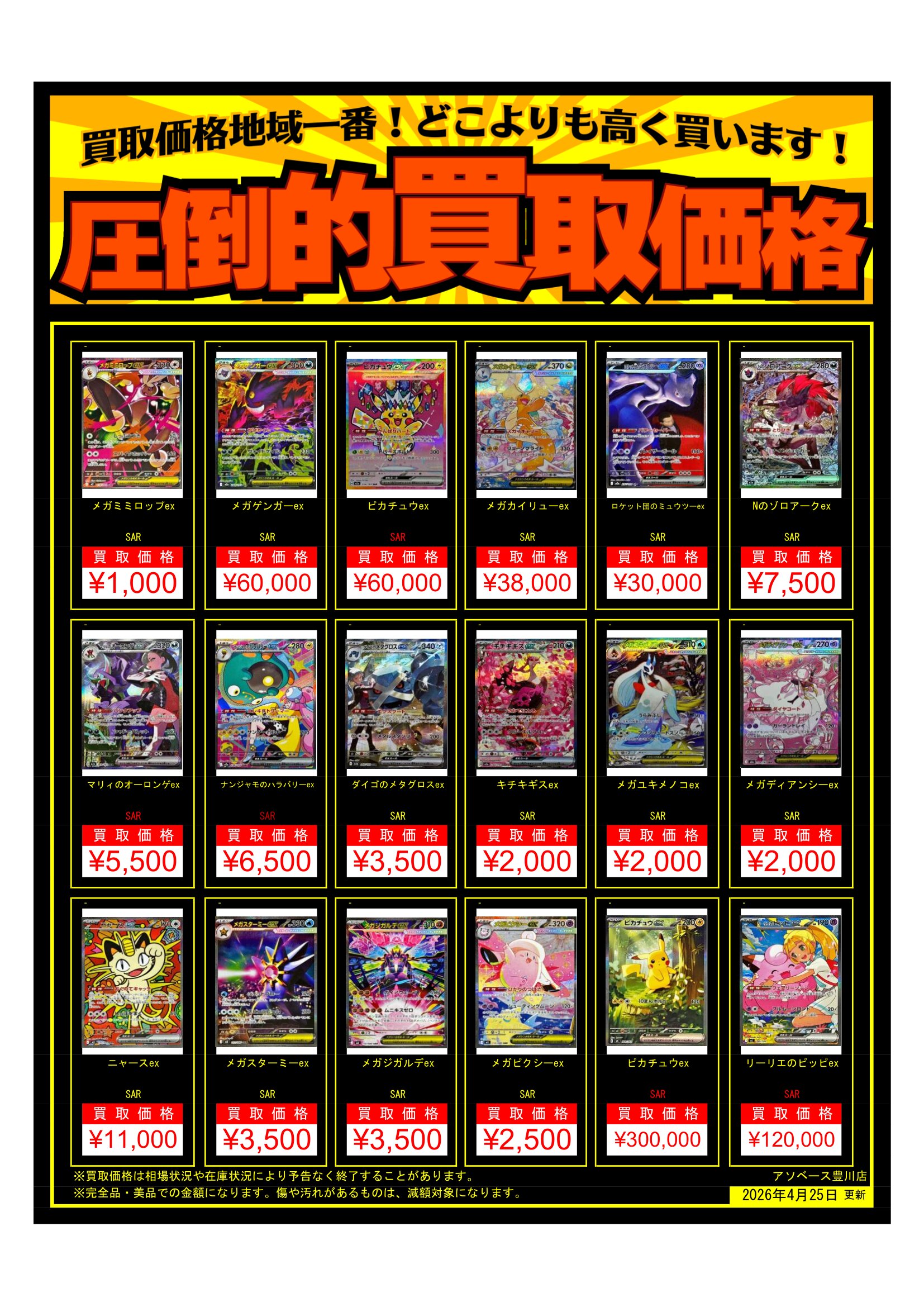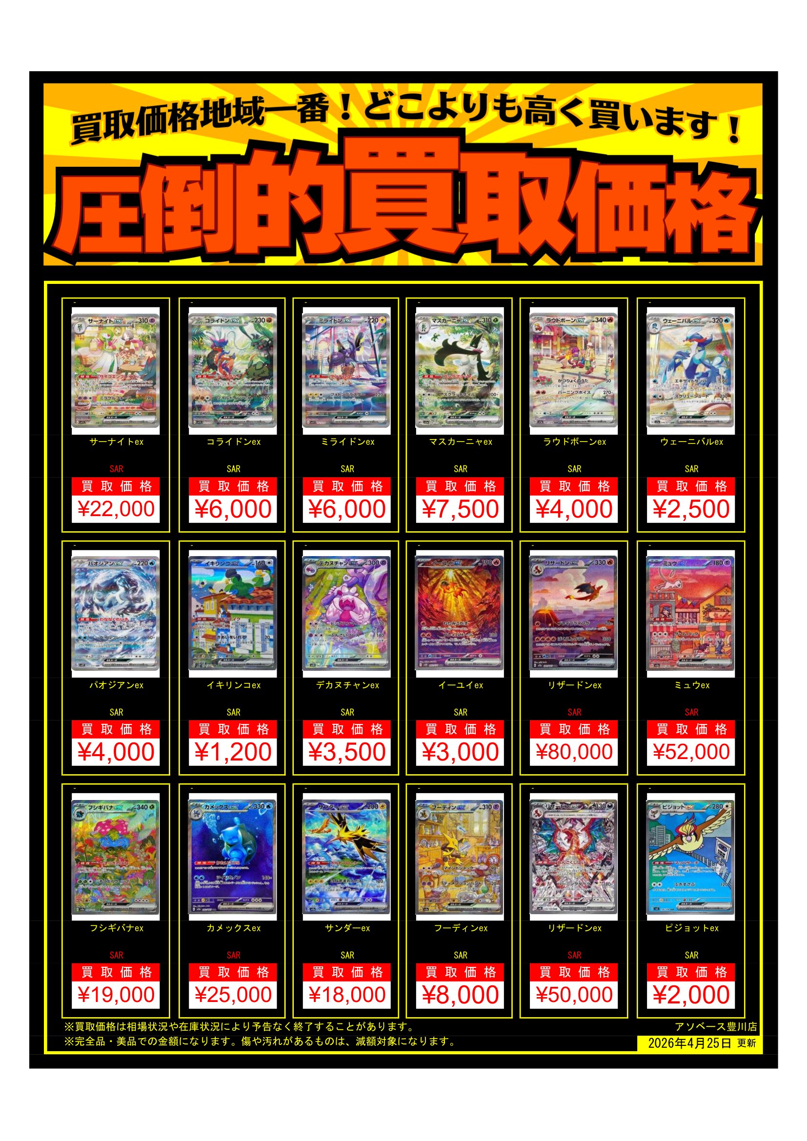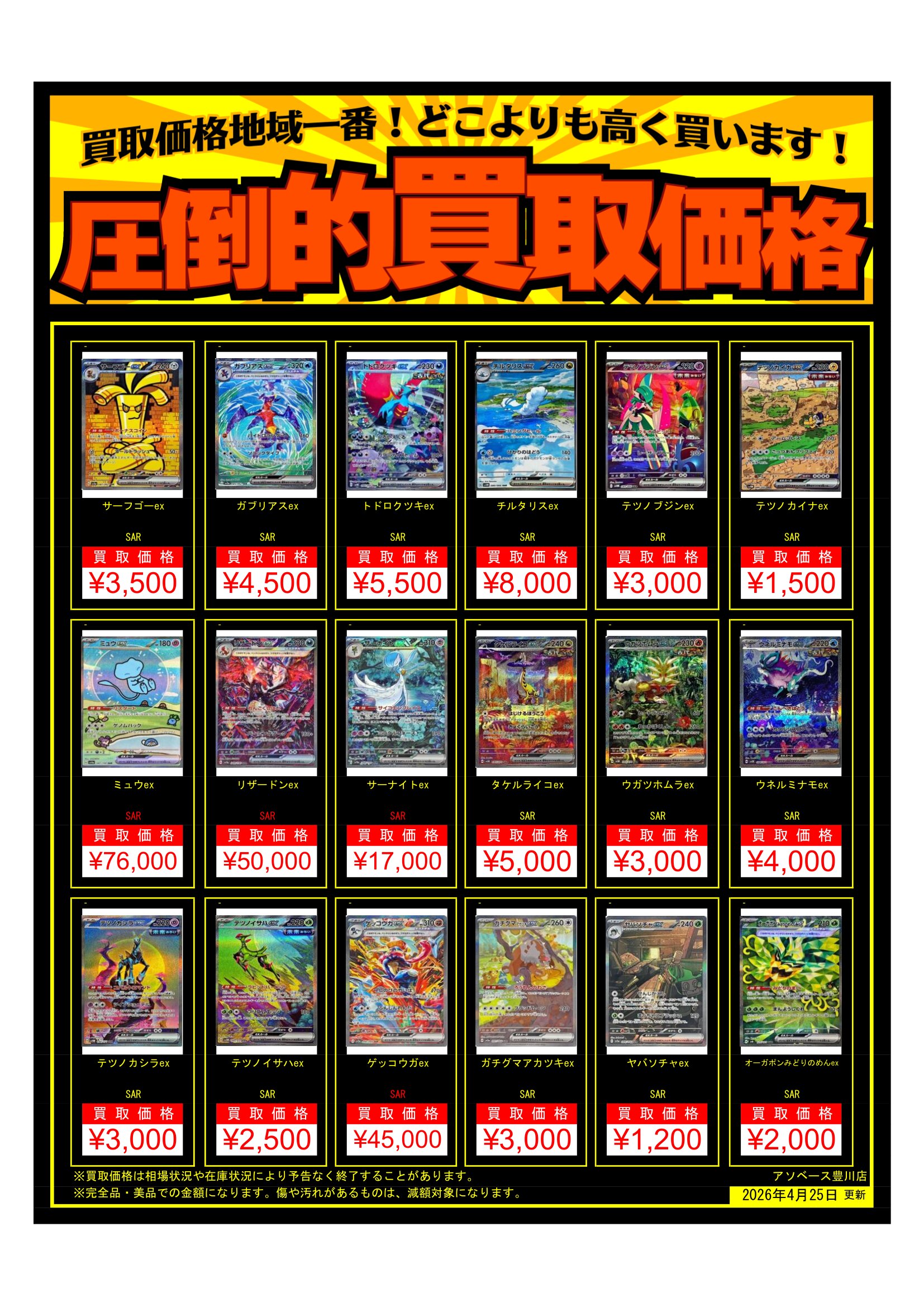 【アソベース豊川店】★ポケモンカード買取告知★ new アソベース豊川店 豊川店 買取情報 豊川店 カード 2026年4月25日 ★買取情報★ ※2026/4/25現在の価格となります。 在庫状況・状態によってお値段が変動いたします。予めご了承ください。 **************** こちら↓もぜひチェックしてみてくださいね♪(*´▽`*) ・最新のイベント情報はこちら ・最新の買取情報はこちら
