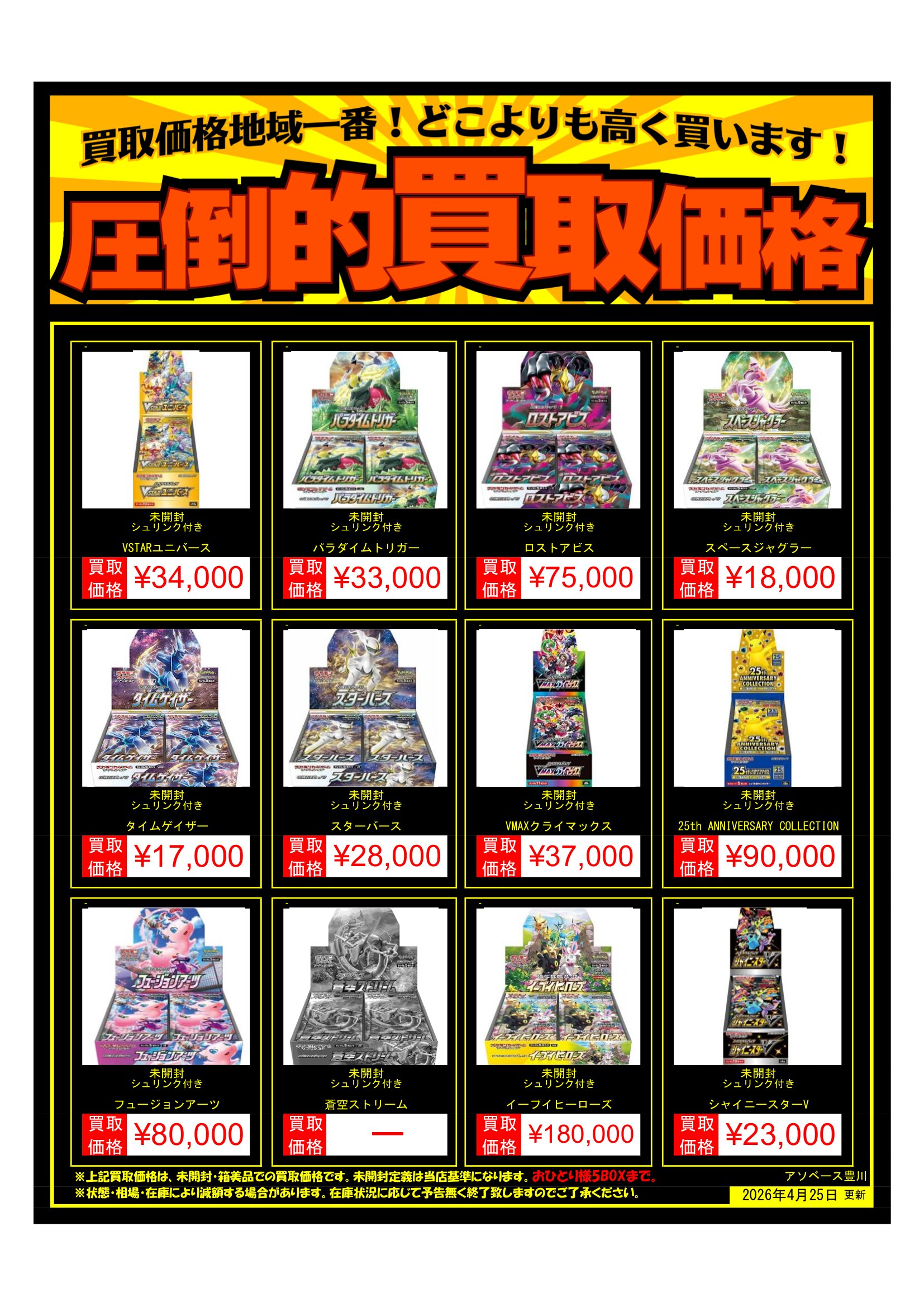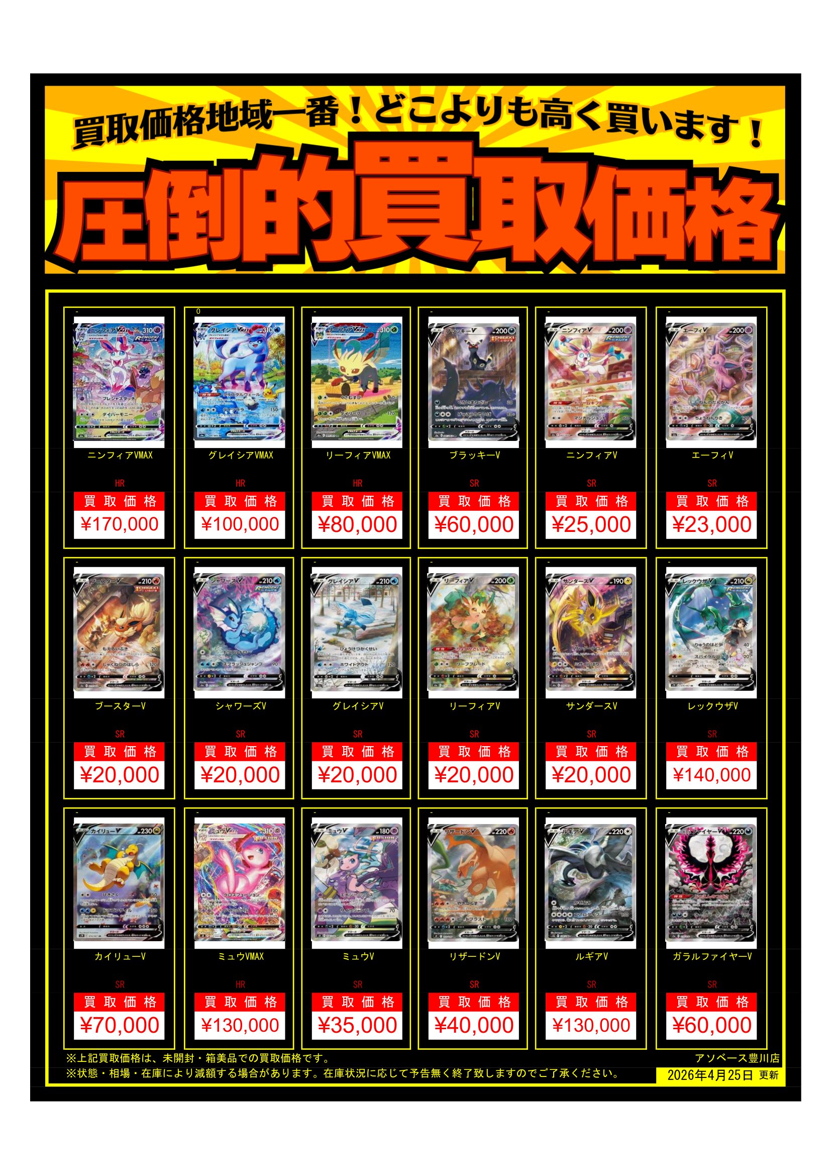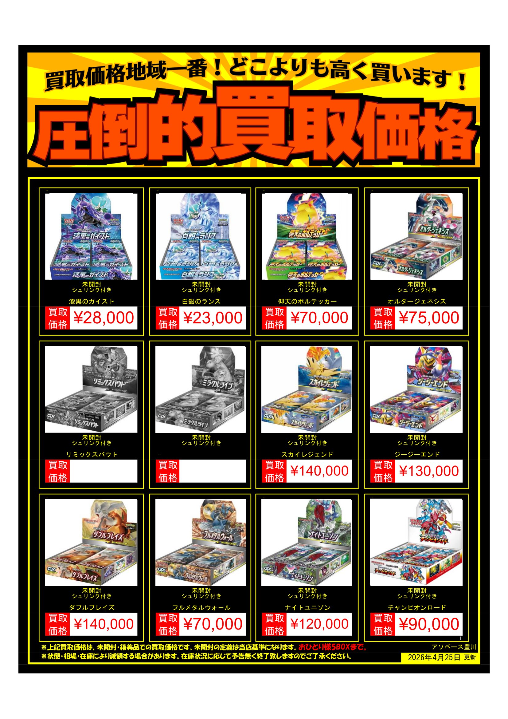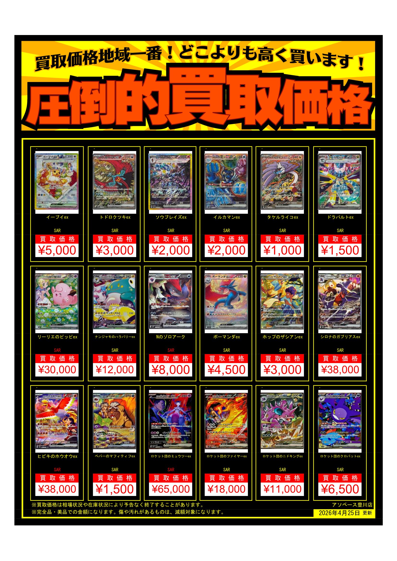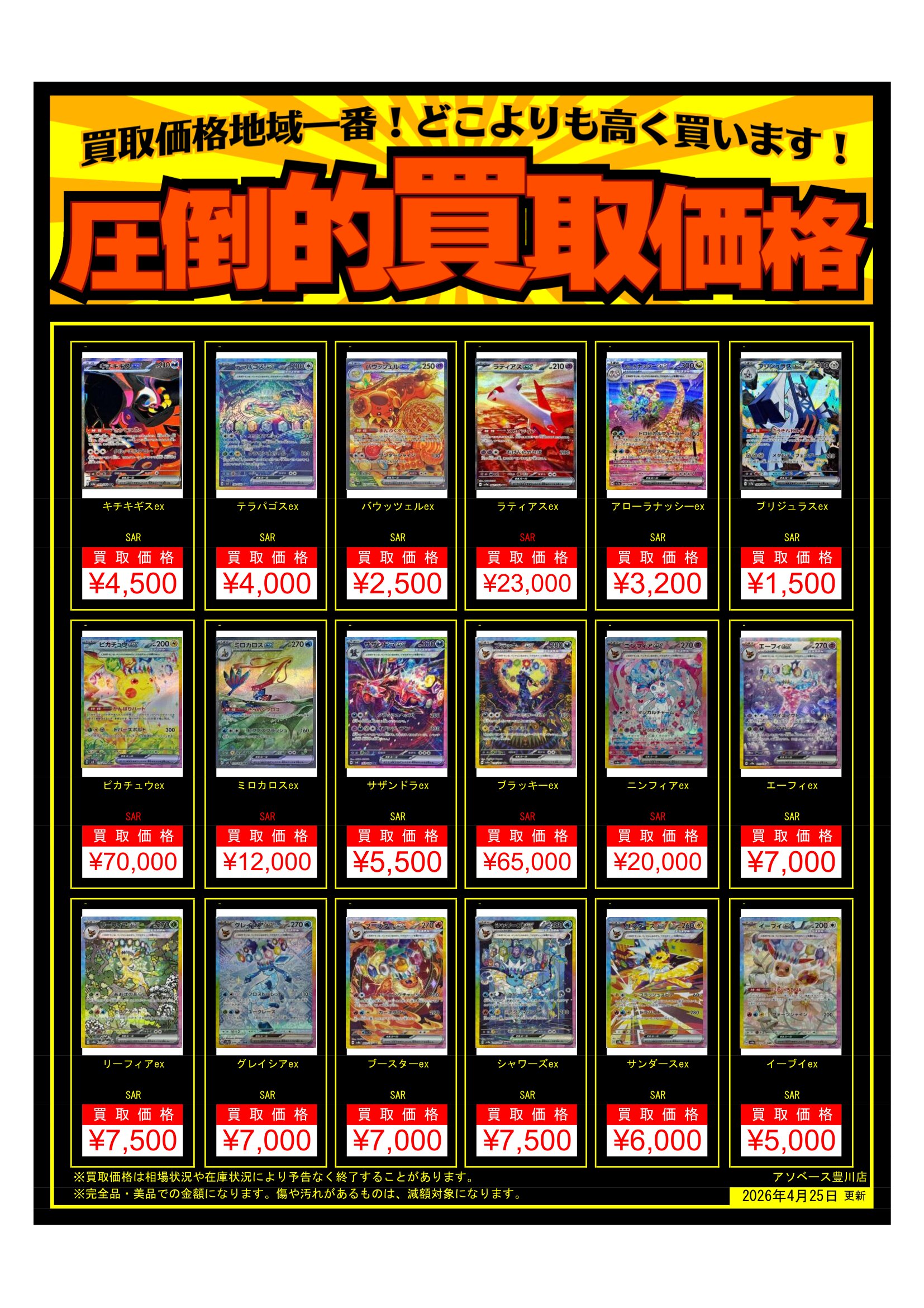 【アソベース豊川店】★ポケモンカード買取告知★ new アソベース豊川店 豊川店 買取情報 豊川店 カード 2026年4月25日 ★買取情報★ ※2026/4/25現在の価格となります。 在庫状況・状態によってお値段が変動いたします。予めご了承ください。 **************** こちら↓もぜひチェックしてみてくださいね♪(*´▽`*) ・最新のイベント情報はこちら ・最新の買取情報はこちら