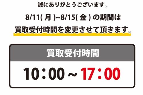 【四日市日永店】《8月11日~15日》★買取受付時間変更のご案内★