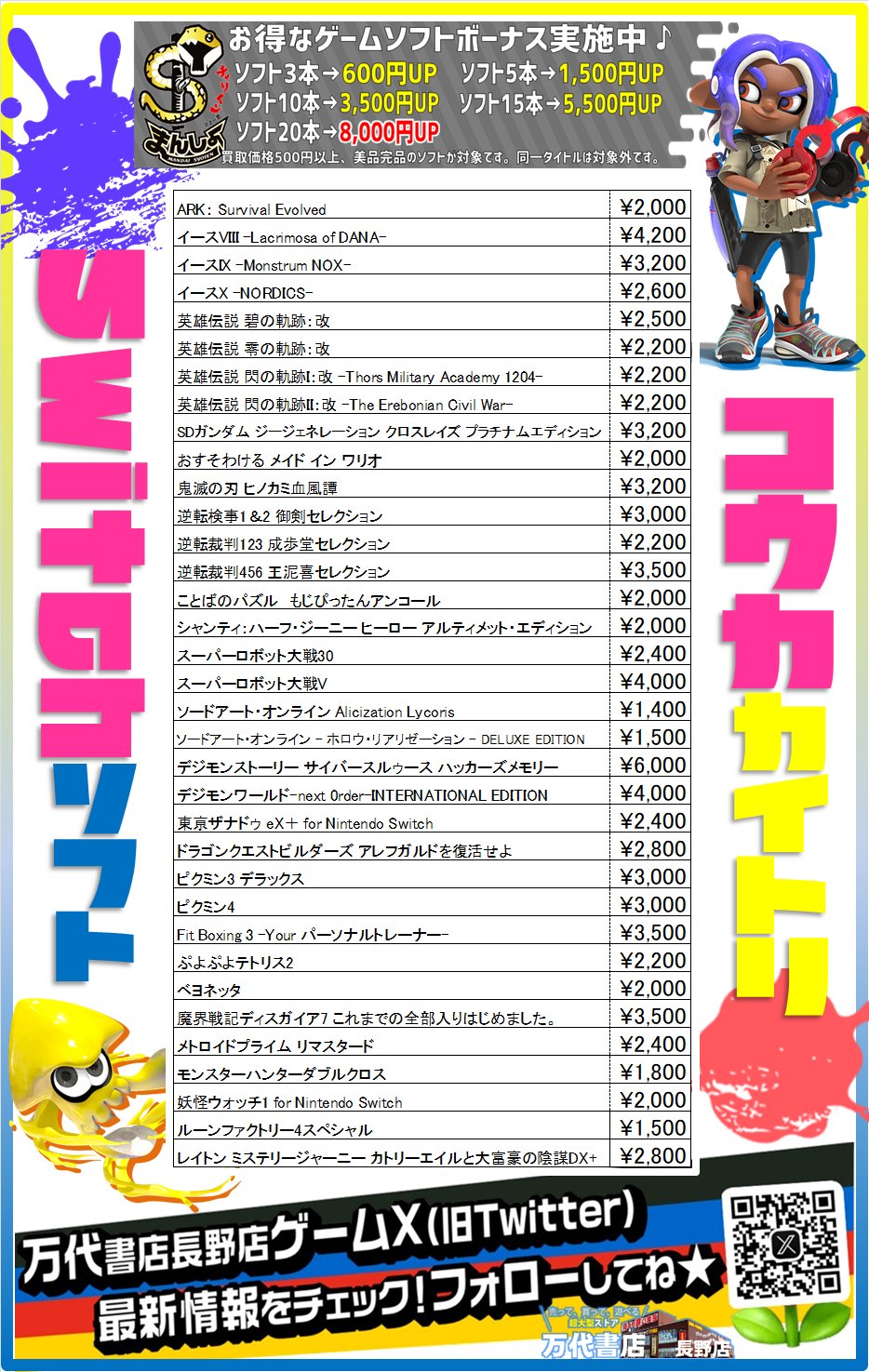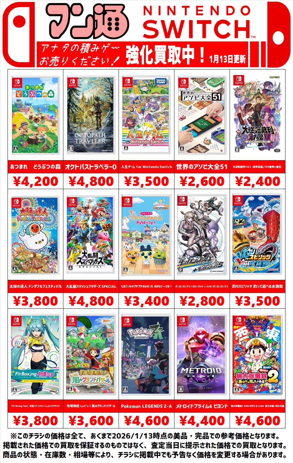 2026.01.13 ゲーム takalab_5 ■ゲームSNS更新いたしました!■ 【#ゲーム買取情報】 #Switch ソフトの買取チラシを更新しました 「オクトパストラベラー0」4800円買取 「メトロイドプライム4 ビヨンド」4400円買取 その他掲載外ソフトも高価買取中ですので、是非 #万代書店長野店 までお持ちください ★Xはこちらから★ コメントを残す コメントをキャンセルメールアドレスが公開されることはありません。 ※ が付いている欄は必須項目ですコメント ※ 名前 ※ メール ※ サイト 新しいコメントをメールで通知 新しい投稿をメールで受け取る Δ