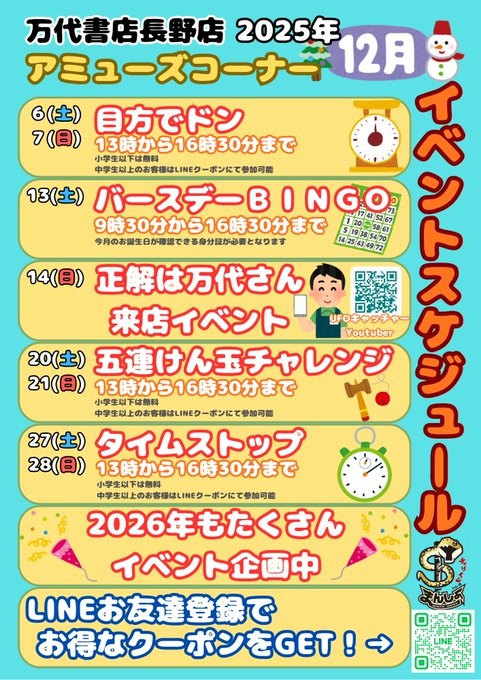 12月のイベントと入荷予定表になります☺雑貨やぬいぐるみなど記載に無く入荷するものや予定が変更になるものなどが出る恐れがあります。 pic.twitter.com/oMPvt2Wscf — 万代…