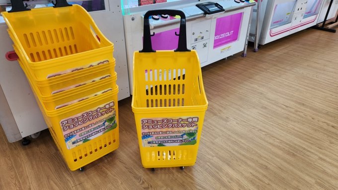 先日より設置しました、今ウワサのやつ!アミューズコーナー用ショッピングバスケット!キャスターついて便利😆景品たくさんゲットしたとき、大きい景品、重たい景品ゲットしたとき、車に景品一度置きにもどるのが面倒な…