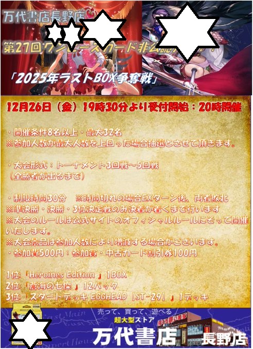 期間中となりますが目標枚数在庫が集まった為強化買取終了となります。沢山のお持ち込みありがとうございました。 — 万代書店長野店 カード (@mansho_n_card) November 30, 2025