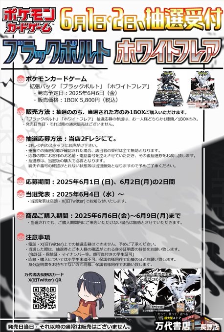 6月6日(金)発売予定 ポケモンカードゲーム 拡張パック 「#ブラックボルト 」 「#ホワイトフレア」 抽選販売のお知らせです! ・応募期間、6月1日~2日の2日間。 店頭受付のみ 、お一人様どちらか一種類/1BOXのみ…