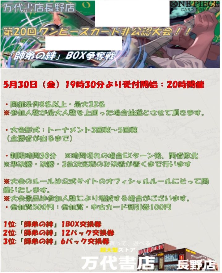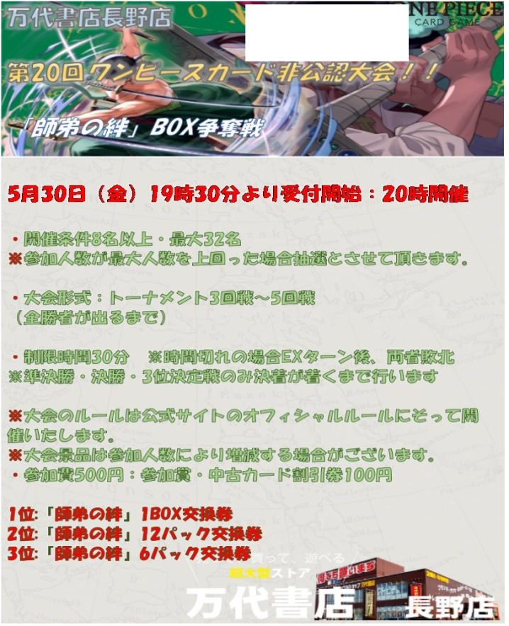 月末ワンピース非公認BOX大会 5月30日(金)19時30分より受付開始!20時頃開催! 優勝者は師弟の絆1BOX交換券 参加人数20名以上でお楽しみ抽選会開催! 是非ご友人など誘ってご参加ください!! pic.twit…