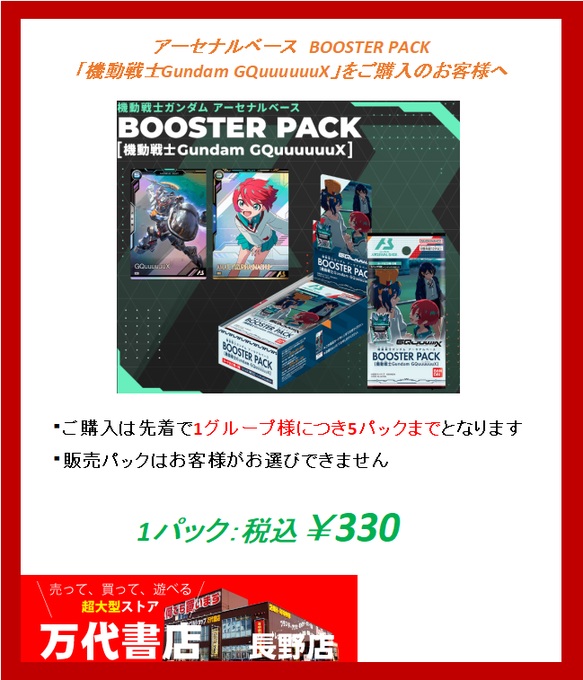 明日発売のアーセナルベース BOOSTER PACK 「機動戦士Gundam GQuuuuuuX」は 入荷数が少ないため1グループ様につき5パックまでの購入制限を付けさせていただきます ご了承くださいませ#アーセナルベー…