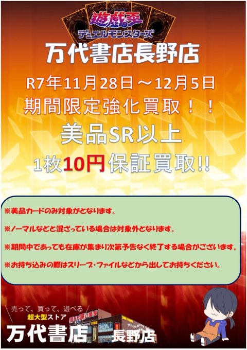 期間中となりますが目標枚数在庫が集まった為強化買取終了となります。沢山のお持ち込みありがとうございました。 — 万代書店長野店 カード (@mansho_n_card) November 30, 2025