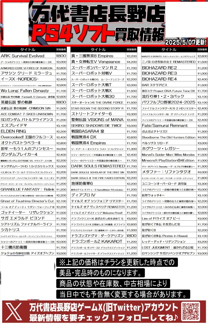 [#ゲーム買取] 情報#PS4 ソフトの買取チラシを更新しました。 「#ELDENRING」2200円買取「#ジョジョの奇妙な冒険アイズオブヘブン」3500円買取 その他掲載外ソフトも高価買取中ですので、是非万代書店長野…