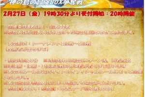 月末恒例!ワンピース非公認BOX大会 今月も開催いたします!! 19時30分より受付開始!20時頃開始!優勝者には「神の島の冒険」1BOX交換券! 参加人数20名以上でお楽しみ抽選会開催!是非、友人など誘ってご参加くださ…