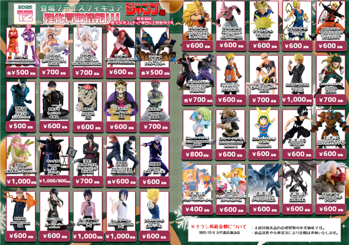 一番くじフィギュア等の買取情報を更新しました(^^)/★ ぜひ万代書店諏訪店に買い取らせてくださいm(__)m お待ちしております!! チラシの掲載金額は店頭買取時での参考価格となりますのでご了承くださいませ。 2025…
