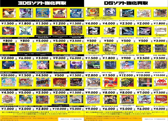 レトロゲームWEBチラシ ※買取価格は 2025/6/23 変更時点での価格になります ※上記価格は完品・美品での買取価格となります(パッケージ汚れ、端子ダメージ、シール剝れ等は減額対象又は対象外となる場合があります) …