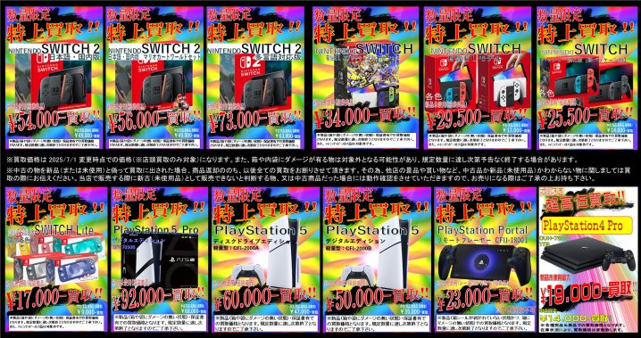 ゲームハード超々高価買取!! SWITCH 2 → 新品も中古も超高額買取中!! 下記画像の本体を超高額買取中!!(※赤文字の価格は新品買取価格となります。また、一部中古買取不可の商品があります) 数量集まり次第終了とな…