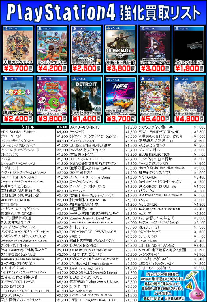 PS4|ニンテンドーSwitchソフトの買取告知更新しました! 皆様からの買取じゃんじゃんお待ちしております(∩´∀`)∩ ※価格は11/23時点での買取価格になります。 商品状態や相場によっ…