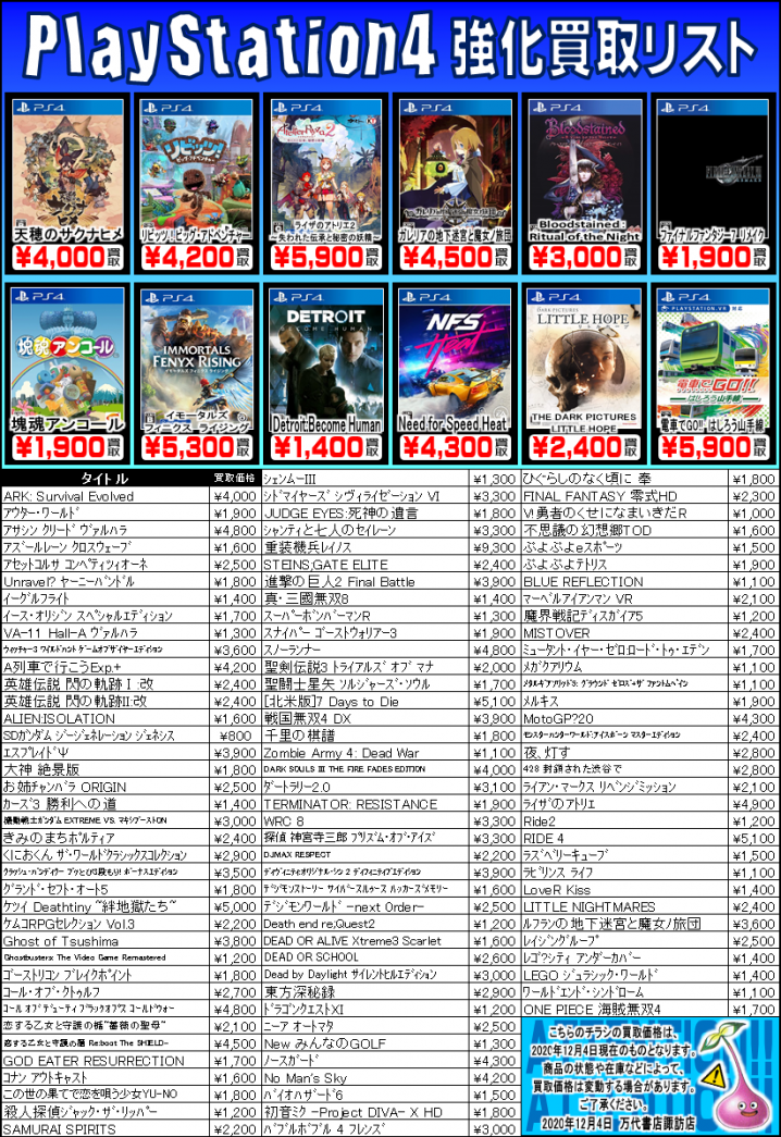 ゲームソフトの買取告知更新しました! 皆様からの買取じゃんじゃんお待ちしております(∩´∀`)∩ ※2020/12/4現在の買取価格となります。 在庫状況・状態によってお値段が変動いたします。予めご了承くだ…