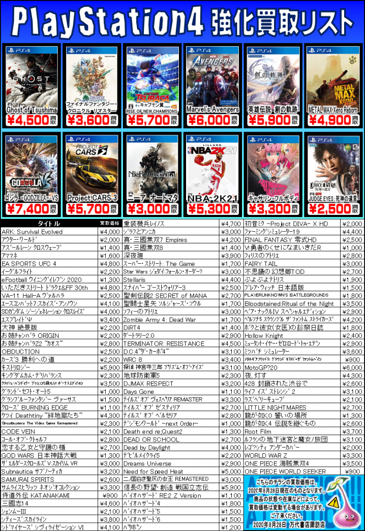PS4|ニンテンドーSwitchソフトの買取告知更新しました! 掲載外商品も買取大募集中! 皆様からの買取じゃんじゃんお待ちしております(∩´∀`)∩ ※2020/8/28現在の…