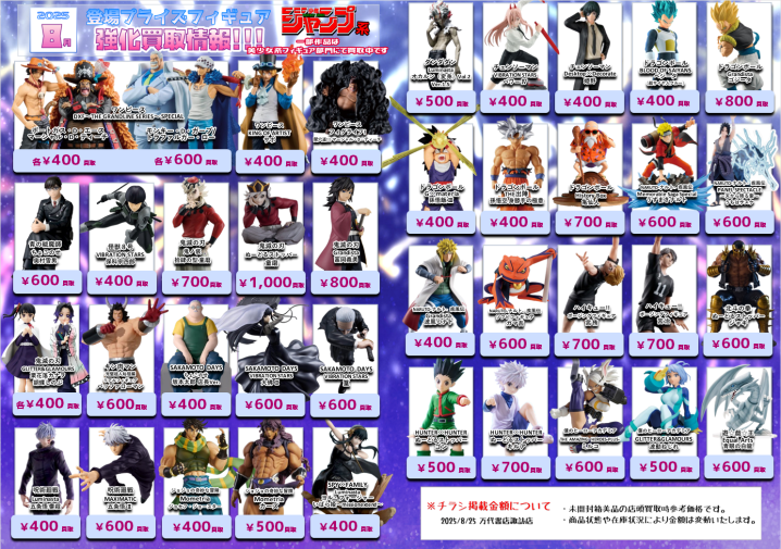 一番くじフィギュア等の買取情報を更新しました(^^)/ ぜひ万代書店諏訪店に買い取らせてくださいm(__)m お待ちしております!! チラシの掲載金額は店頭買取時での参考価格となりますのでご了承くださいませ。 2025/…
