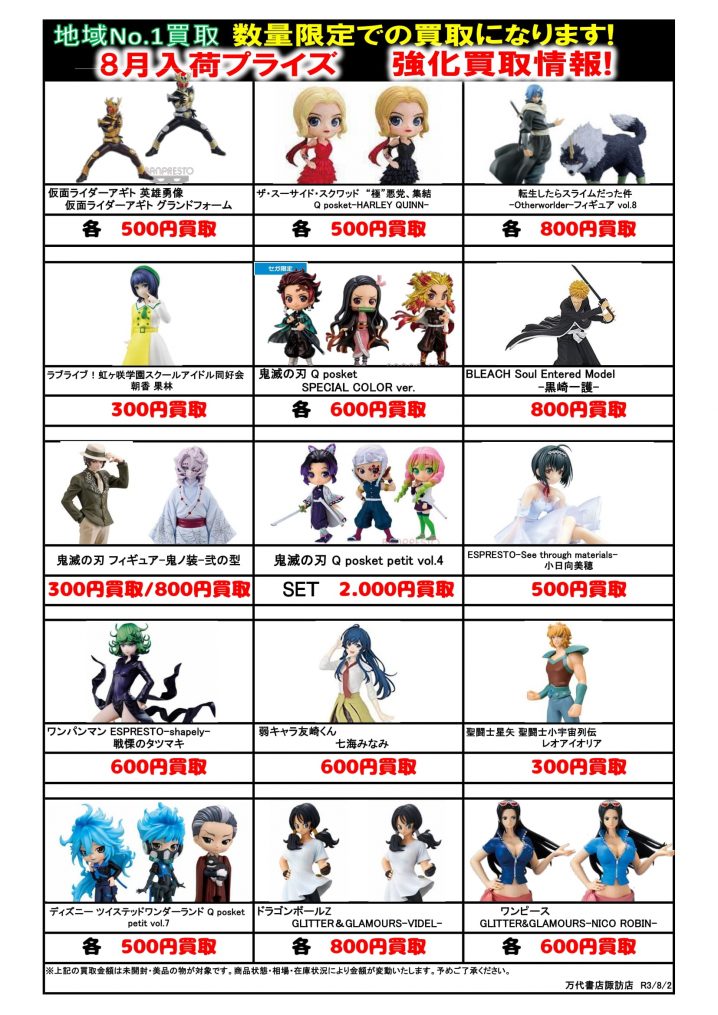 ✨おもちゃコーナー より8月入荷予定プライズフィギュア買取チラシのお知らせ✨ たくさんの買取お待ちしておりま〜す!!! ※2021/8/3現在の買取価格となります。…