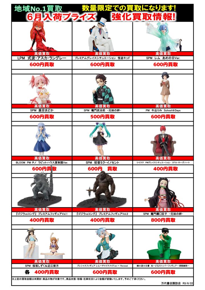 ✨おもちゃコーナーより6月入荷予定プライズフィギュアチラシ更新のお知らせ✨ たくさんの買取お待ちしておりま〜す!!! ※2021/6/22現在の買取価格となります。 在庫状況・状…