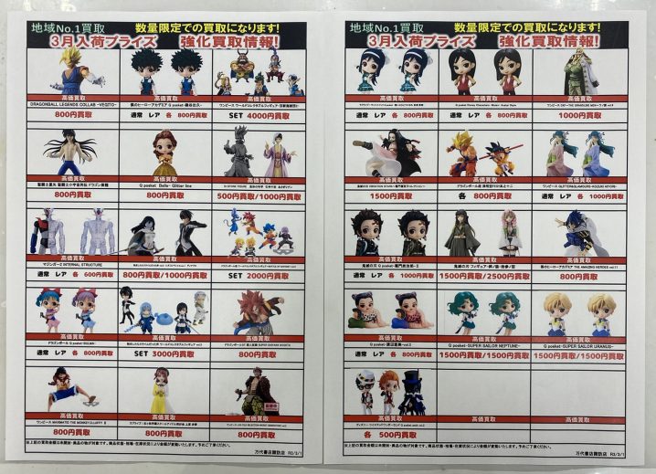 ✨おもちゃコーナーより3月入荷予定プライズフィギュア強化買取のお知らせ✨ たくさんの買取お待ちしておりま〜す(*゚▽゚)ノ ※2021/3/2現在の買取価格となります。 在庫状況・状態によって…