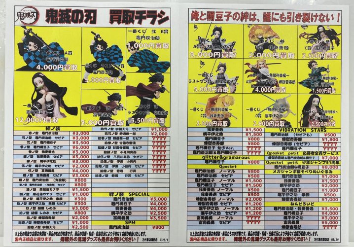✨おもちゃコーナーより鬼滅の刃フィギュア買取チラシ更新のお知らせ✨ たくさんの買取お待ちしておりま〜す(*゚▽゚)ノ ※2021/3/2現在の買取価格となります。 在庫状況・状態によってお値段…