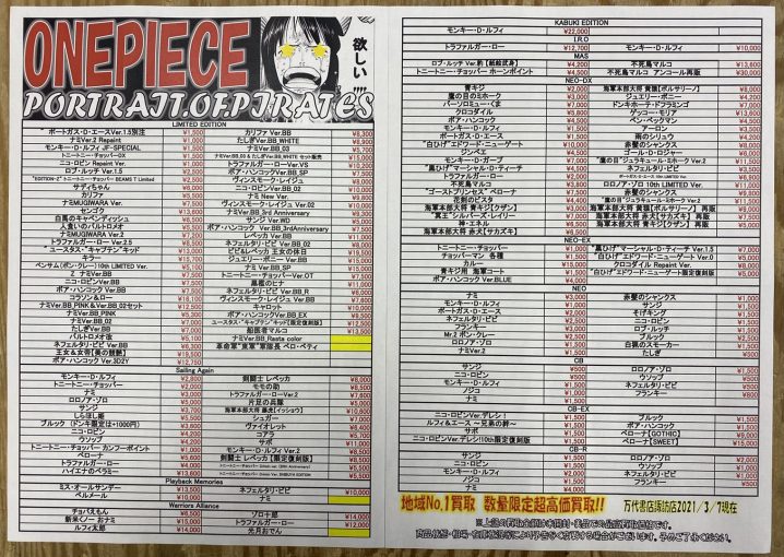 ✨おもちゃコーナーよりワンピースフィギュア P.O.Pシリーズ買取チラシ更新のお知らせ✨ 抜けていた商品と新しく販売等された物を追加致しました!!! 買取のお持ち込みの際はお早めに〜(^^) …